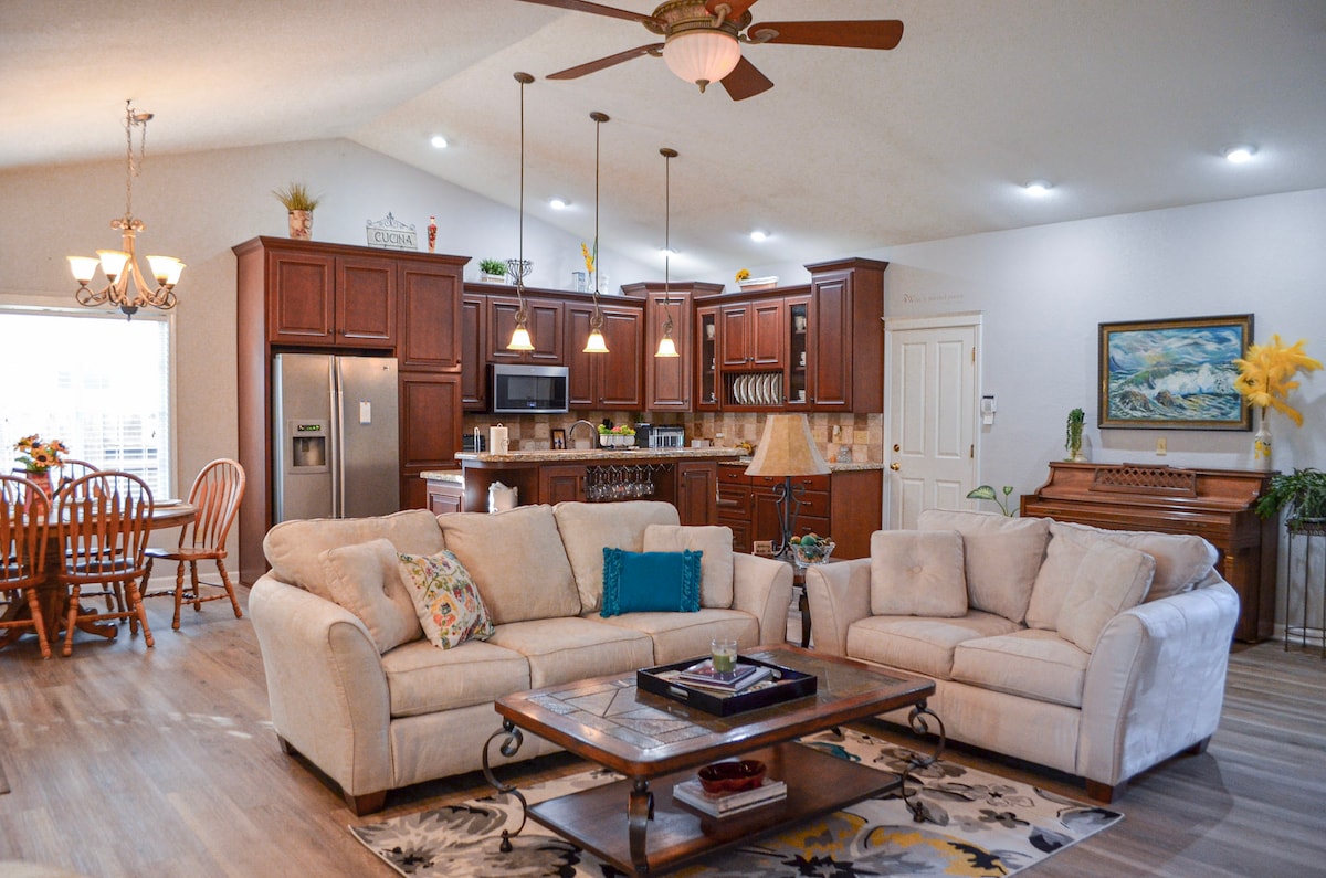 Un lugar muy mágico que llamamos hogar. ¡Enclavado en medio de 20 acres de nogales establecidos, se encuentra tu nueva escapada favorita! Puedes simplemente sentarte y relajarte en la hermosa Orchard House o salir y disfrutar del patio/piscina/barbacoa/fogata y spa. ¡Uno de los dormitorios que aparecen en el anuncio está arriba en una torre de juegos, llena de opciones de entretenimiento! Además, si amas a los animales tanto como nosotros, puedes ayudar a alimentar a nuestros amigos peludos y emplumados. De cualquier manera... ¡Prepárate para enamorarte!