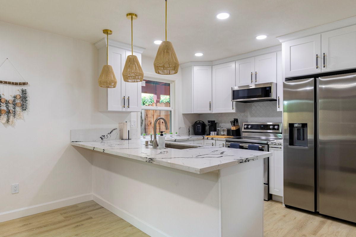 Our completely remodeled modern duplex in Modesto, CA offers a unique blend of style, comfort, and security, making it the perfect retreat for your stay. Contemporary Design: Step into a stylishly designed fully renovated space featuring a fresh and inviting ambiance with a King and a Queen beds. Indulge in the state-of-the-art amenities, including a fully equipped open kitchen with stainless steel appliances, luxurious bathrooms , TVs in living and master, private yard and high-speed Wi-Fi.