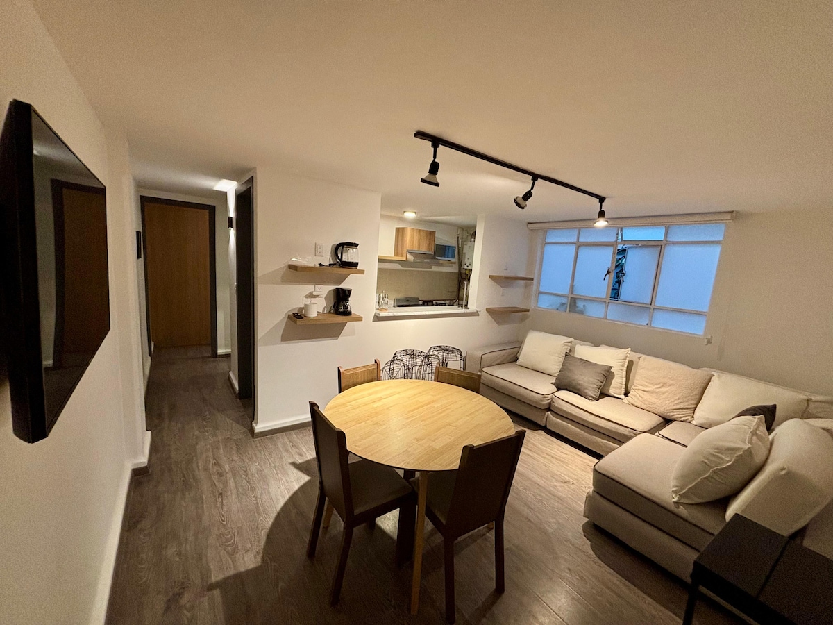 El apartamento se encuentra en una calle toda arbolada en la Colonia Narvarte. Se ubica a 8 minutos del Metro Eugenia. Enfrente hay una cafetería, a una o dos cuadras hay frutería, restaurantes, lavanderías, tortillerías, Oxxo, minisupers, cervecerías, heladerías, etc. Se encuentra en segundo piso y consta de sala, comedor, cocina, pasillo y una recámara con baño completo. Tiene cafetera, horno eléctrico, de microondas, licuadora, todos los instrumentos de cocina. Cuenta con TV, Cable y Netflix.