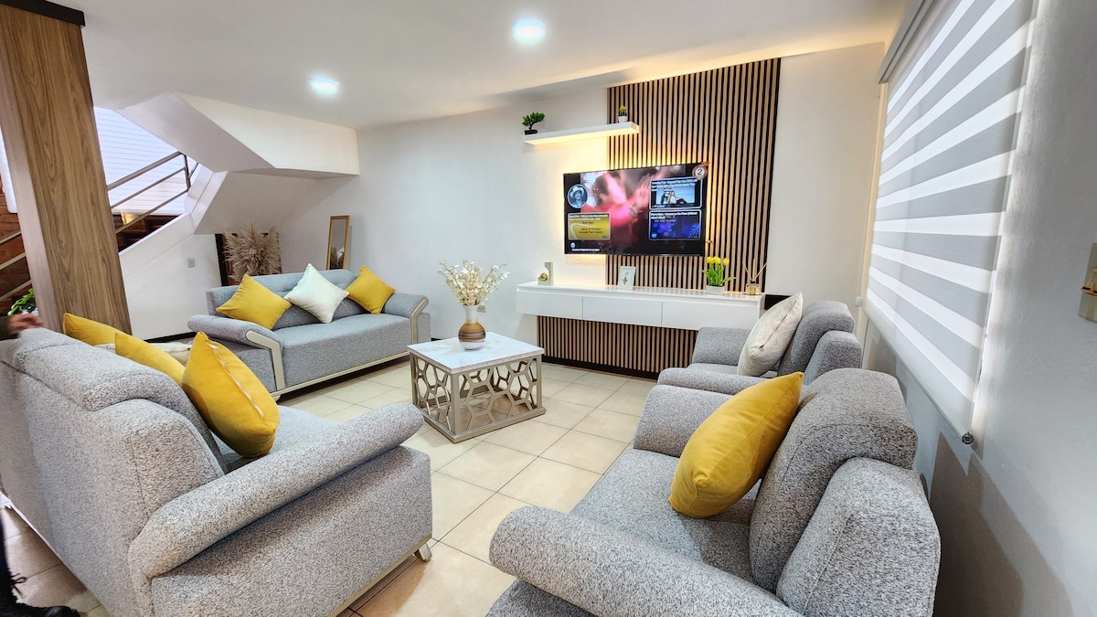 Absorba la relajante luz y calidez que penetra todo el espacioso ambiente a travez de las grandes ventanas y tragaluces. Relájate debajo de unos amplios cielos raso de 3 metros en las habitaciones y uno abovedado de 6 metros en la cocina abierta estilo americano. ⚡️ agua caliente, Wi-Fi y luz para tus dispositivos las 24/7 gracias al sistema de baterías de respaldo. Ojo: algunos electrodomésticos de alto consumo, cómo el secador de pelo y la tetera, no funcionan durante los cortes de energía.