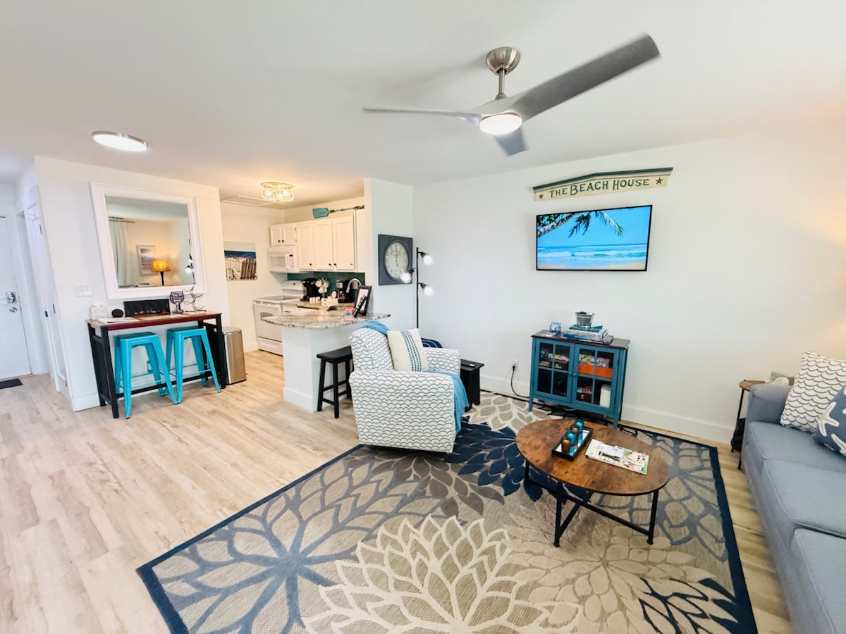 ¡Bienvenido a The Salty Pirate, tu paraíso vacacional frente al mar! Relájate en nuestro tranquilo y elegante apartamento con cama tamaño king, baño de lujo y cocina americana. Relájate en la cama, disfruta de los barcos que pasan o mira la televisión de 65 pulgadas. El balcón frente al mar te invita a leer y relajarte. Disfruta de la piscina estilo resort o reserva el kayak de 2 plazas (cuando esté disponible) para explorar la vía fluvial. ¡Los restaurantes y bares del centro de la ciudad están a poca distancia a pie y las playas de arena blanca están a 2 millas de distancia!