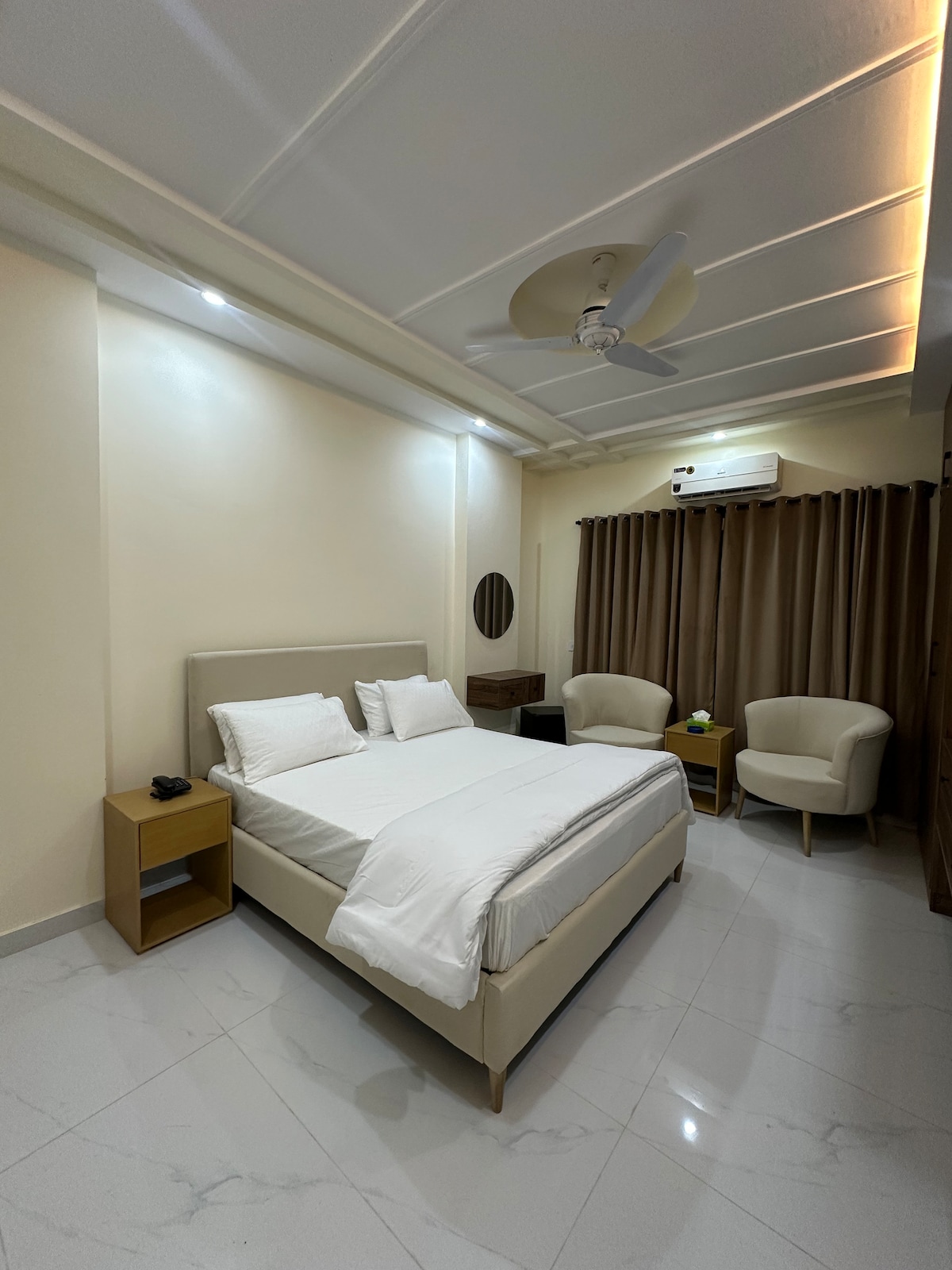Bienvenido a nuestras elegantes suites de dos dormitorios en DHA 5 Islamabad. Disfruta de la comodidad de un viaje rápido y relájate en un espacio con una decoración encantadora y un cine en casa totalmente equipado. Ideal para viajeros que buscan comodidad y entretenimiento, este acogedor refugio ofrece comodidades modernas en una ubicación privilegiada. Es una porción completamente separada con su propia entrada y estacionamiento separados, apto para familias, por lo tanto, muy seguro y tranquilo. No se permiten fiestas ni música alta. No se admiten parejas solteras