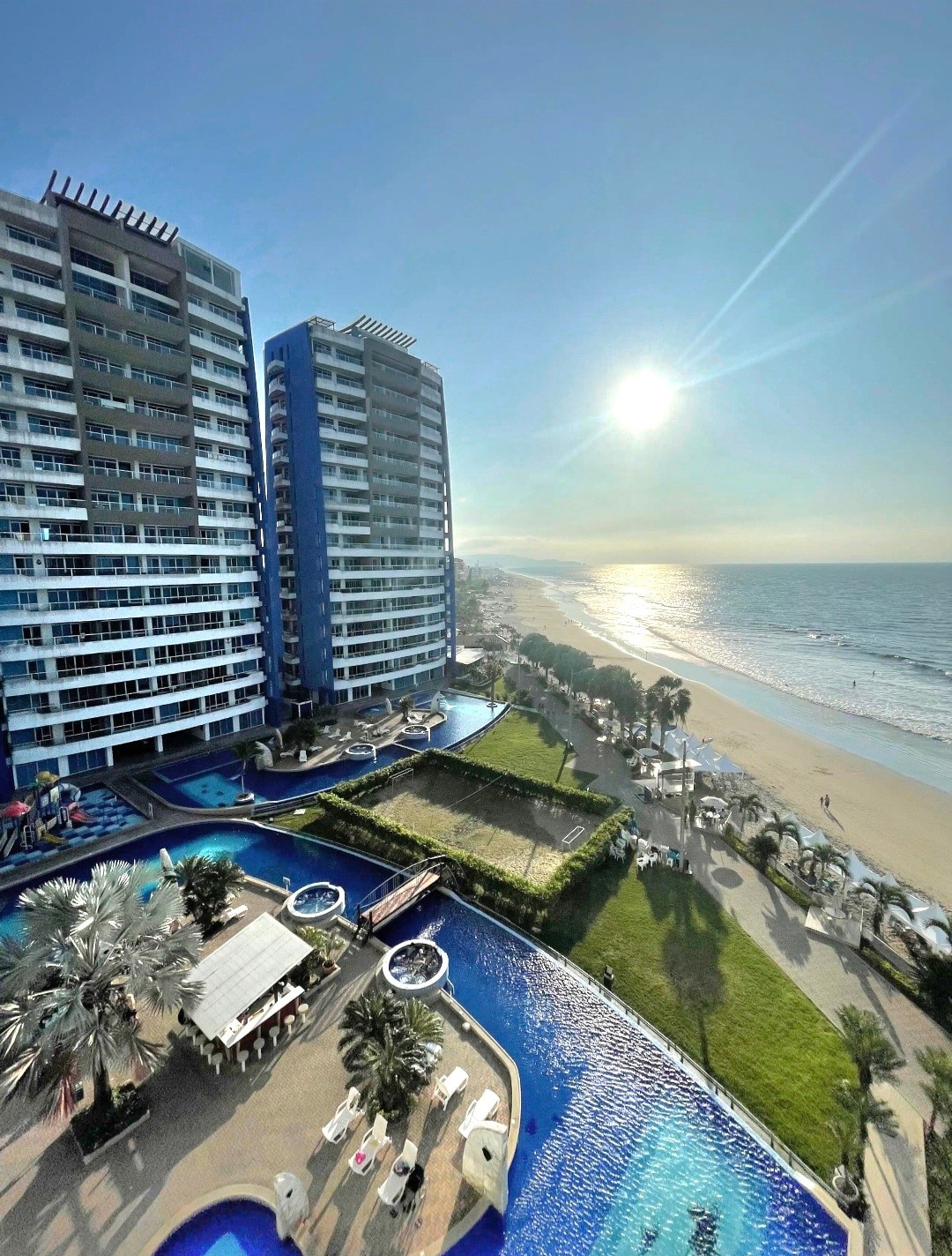 Disfruta el placer de estar frente al mar, en el edificio más alto y lujoso de costa del pacifico. Seguridad permanente, cuenta con sala, comedor con salida a terraza con jacuzzi, te brinda una vista espectacular del mar, cocina estilo americano, área de máquinas, baño social, dos habitaciones, dos baños , Tv smart, aire acondicionado, parqueadero. Carpa privada en la playa, piscina de 800 m2, parque de agua infantil, hidromasaje, sauna, turco, fitness center, cancha de voley, basquet, tenis