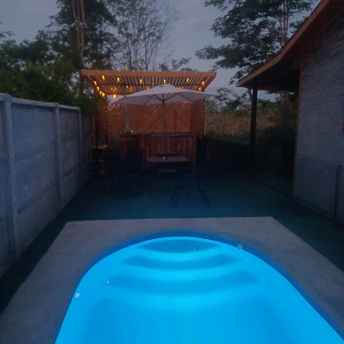 Única cabaña inmersa en media hectárea (5.000m2) de bosque nativo privado con minisenderos, PISCINA (verano) y juegos de USO EXCLUSIVO para los huéspedes. WIFI fibra/ 2 SMART TV(HD c Pack DISNEY+/ESPN ETC.)/DirectTV/Agua potable/Gas/Leña/Toallas/Sábanas/lavadora Capacidad p/ 4 personas. 1D. matrimonial y 1D. con 2 camas de 1plaza.; comedor-cocina (full equipada), estufa a leña, 1 baño, barbacoa con parrillero. Cerca de centro de Los Lleuques y a 25 km de Nevados de Chillán