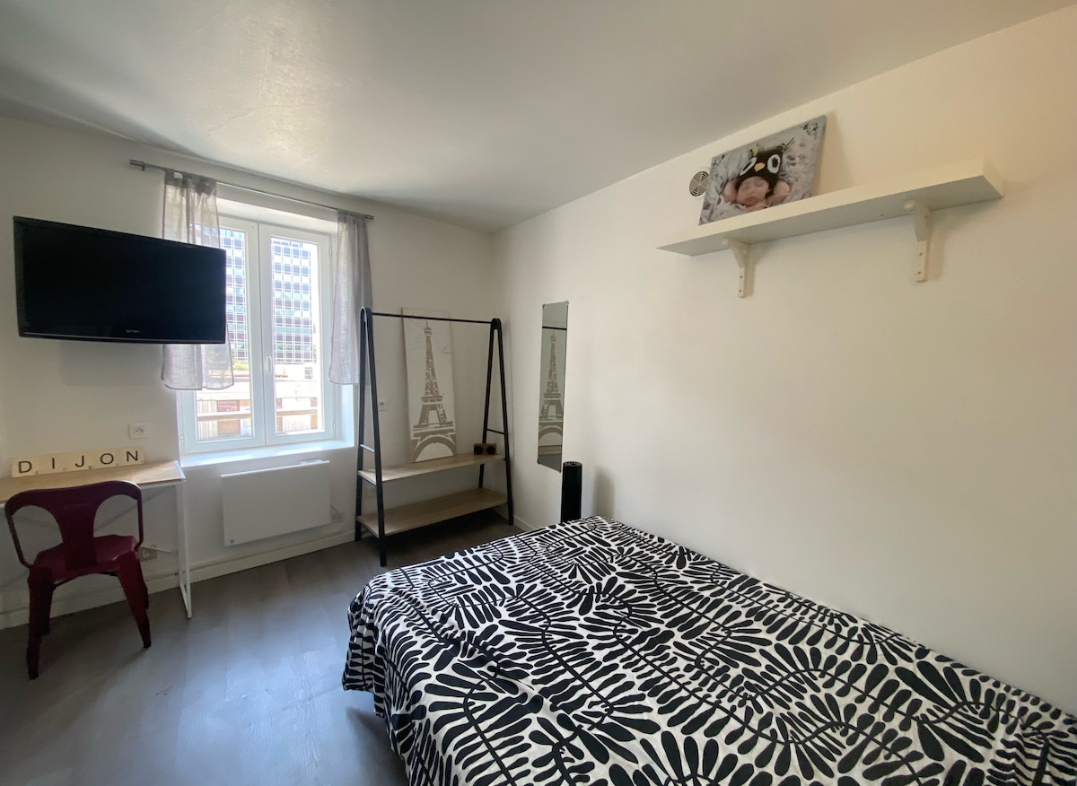 Alojamiento totalmente renovado tranquilo y céntrico. Situado en pleno centro de la ciudad de Dijon, en la calle Chapeau Rouge, en el segundo piso, este alojamiento es muy luminoso. Se encuentra a menos de 5 minutos andando de la estación de tren, el tranvía, los autobuses, la plaza Darcy y a 300 metros de un aparcamiento seguro. Restaurantes, mercados, monumentos históricos, tiendas, panadería, todo está al lado del estudio. Una ubicación ideal tanto para una estancia turística como para un viaje de negocios.