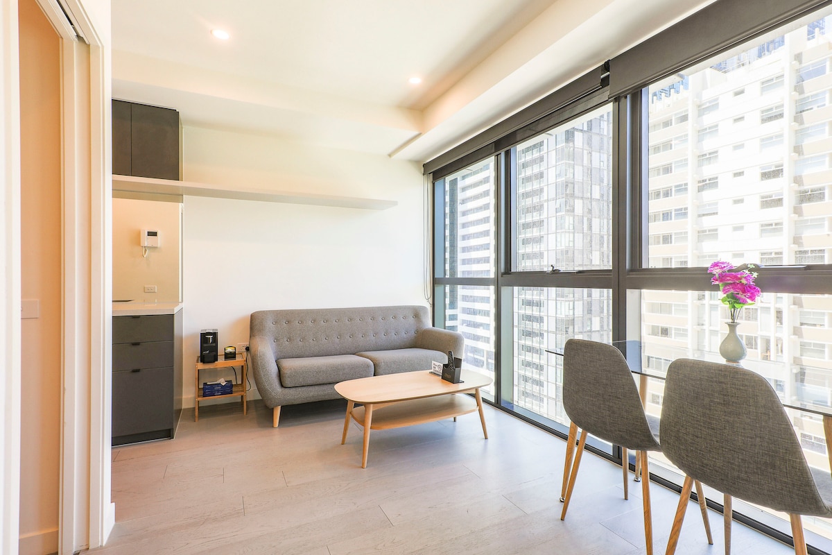 Perched high above the city, this beautifully styled apartment offers sweeping skyline views, a plush queen bed, a fully equipped kitchen, a Nespresso machine for your morning ritual, high-speed Wi-Fi, a private balcony to unwind, and a small welcome treat to make you feel right at home. Just steps from restaurants, Crown, Marvel Stadium, and Southern Cross Station. SkyBus, trains, and trams are all right at your doorstep. Early check-in or late check-out available upon request — please ask