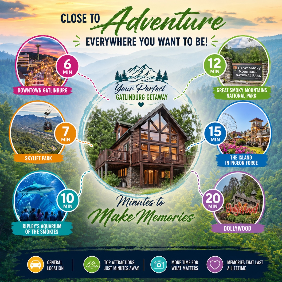 ¡SunDancer Chalet se trata de las vistas! Disfruta de un chalet nuevo, espacioso y bellamente equipado donde tú y tu familia estarán contentos de relajarse y relajarse. Ya sea que estés preparando comidas increíbles con vistas o simplemente relajándote en una de las dos bañeras de hidromasaje. SunDancer te proporcionará una vista majestuosa del Parque Nacional Great Smokey Mountain. Si tienes suerte, es posible que incluso veas un oso o dos. Perfectamente ubicado cerca de la franja de Gatlinburg, lo suficientemente cerca de Pigeon Forge.