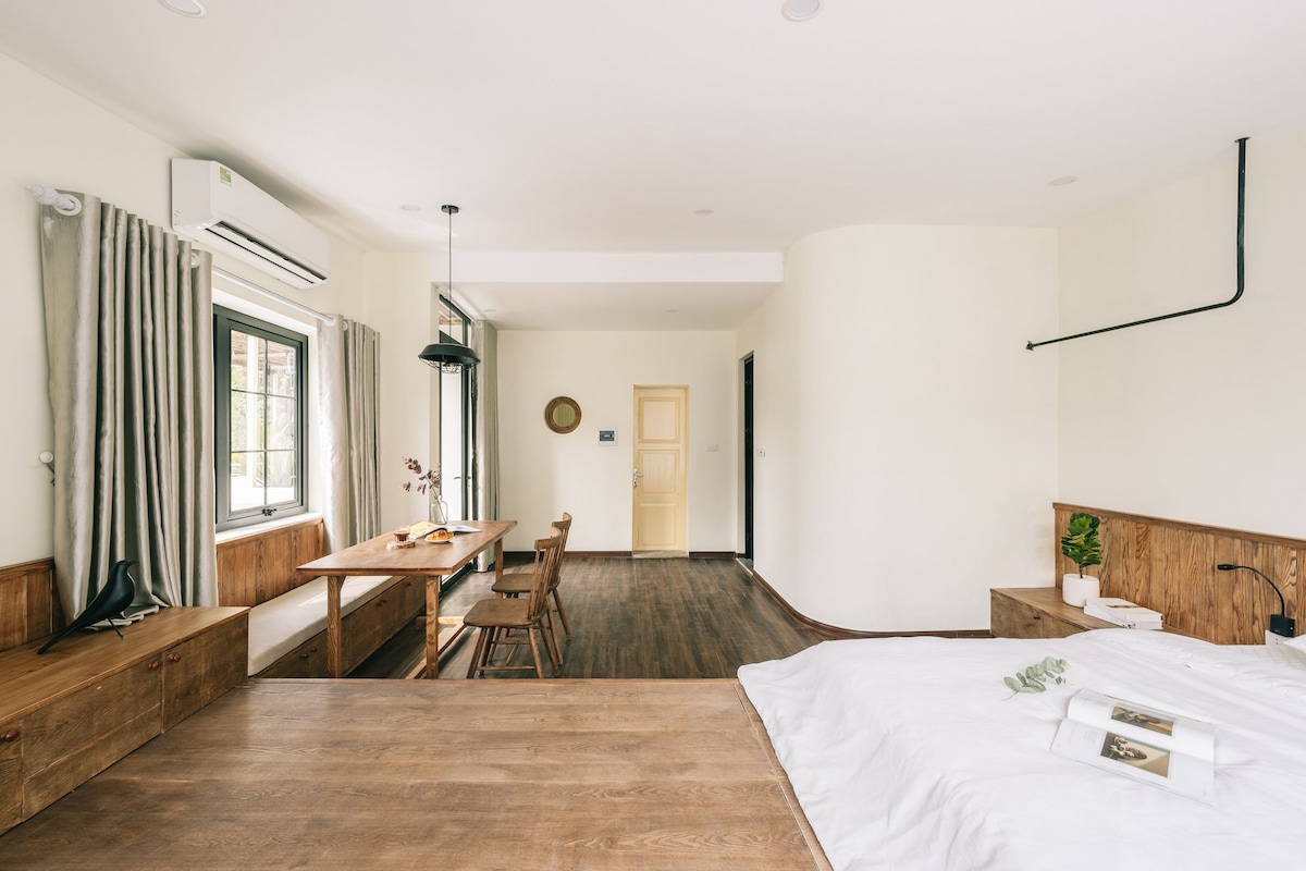 El apartamento está escondido en un pequeño callejón tranquilo, pavimentado con azulejos encáusticos vintage, un estilo que es esencialmente antiguo de Hanói. El callejón es tranquilo y es posible que ocasionalmente veas a algunos vecinos cocinando al aire libre en el patio compartido. Justo al lado vive un músico; a veces deja la puerta abierta y puedes ver el suave sonido de la música o las conversaciones suaves a la deriva por el aire, un pequeño toque del alma de Hanói.