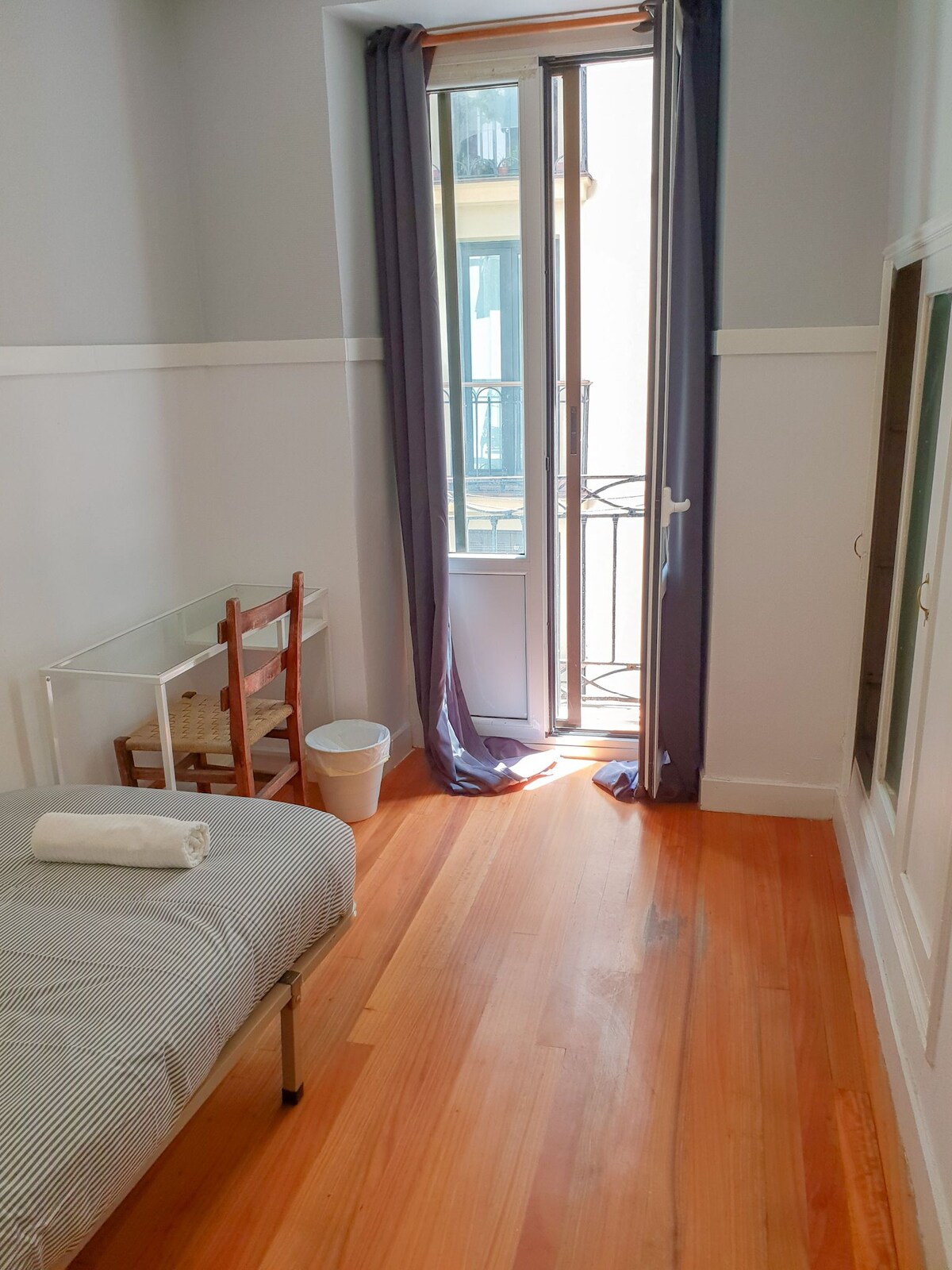 A lovely twin room in Larrea Guest house, the room is very bright and has a balcony. The whole guest house is super clean and has comfortable beds plus triple glazed windows. The Shared bathroom is located outside the room, just opposite. The location is super central and close to both beaches and best pintxo bars and restaurants.