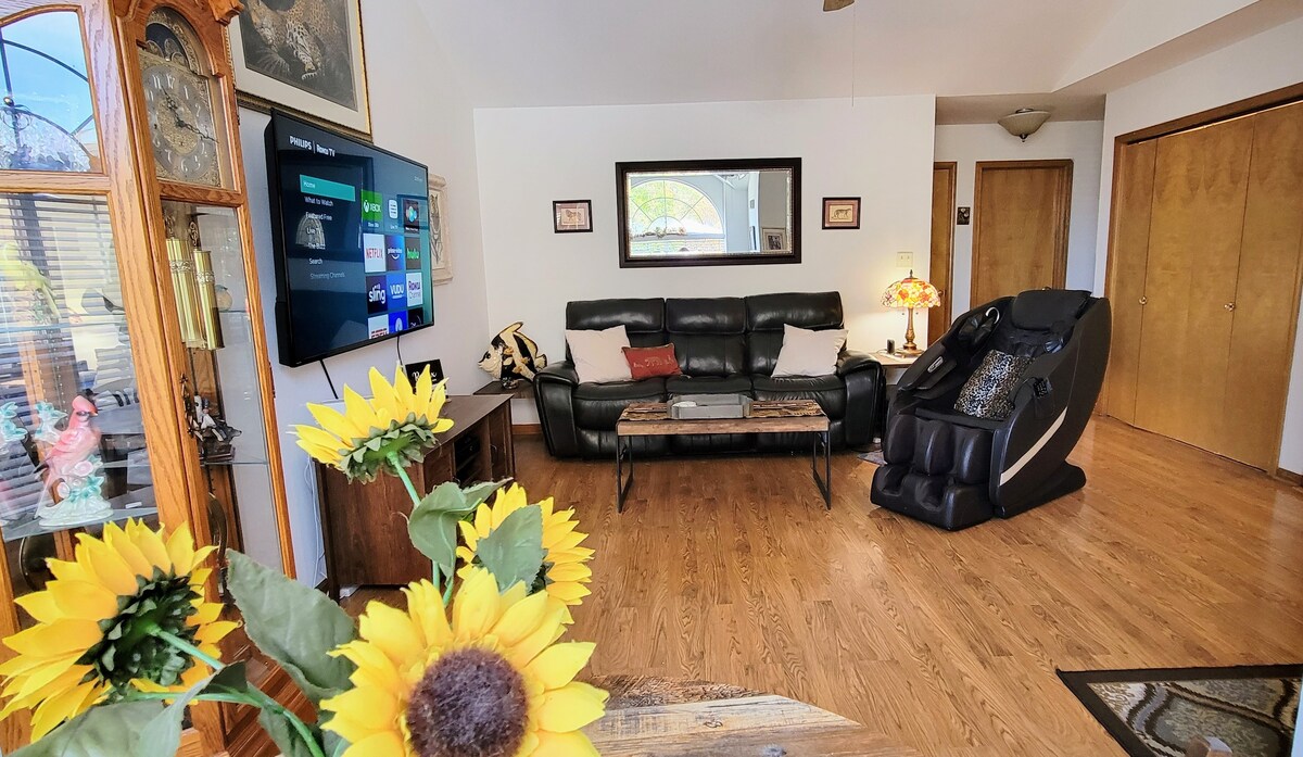 Se aceptan estancias largas, ¡además de obtener un gran descuento! Limpio y desinfectado profesionalmente. El purificador de aire con filtro HEPA asegura un aire libre de gérmenes. Justo al lado de la I-70, tiene sillón de masaje, lavadora y secadora, wifi rápido, cocina surtida, lavavajillas, batidora, olla de cocción lenta, cafetera y mucho más. DVD, Netflix, Hulu, sistema de juegos, estéreo y altavoz Bluetooth. Cerca de KU y del centro de Lawrence. ¡Dos pisos, 2 dormitorios y baño arriba para mayor privacidad! Si necesitas el sofá cama, no dudes en ponerte en contacto conmigo.