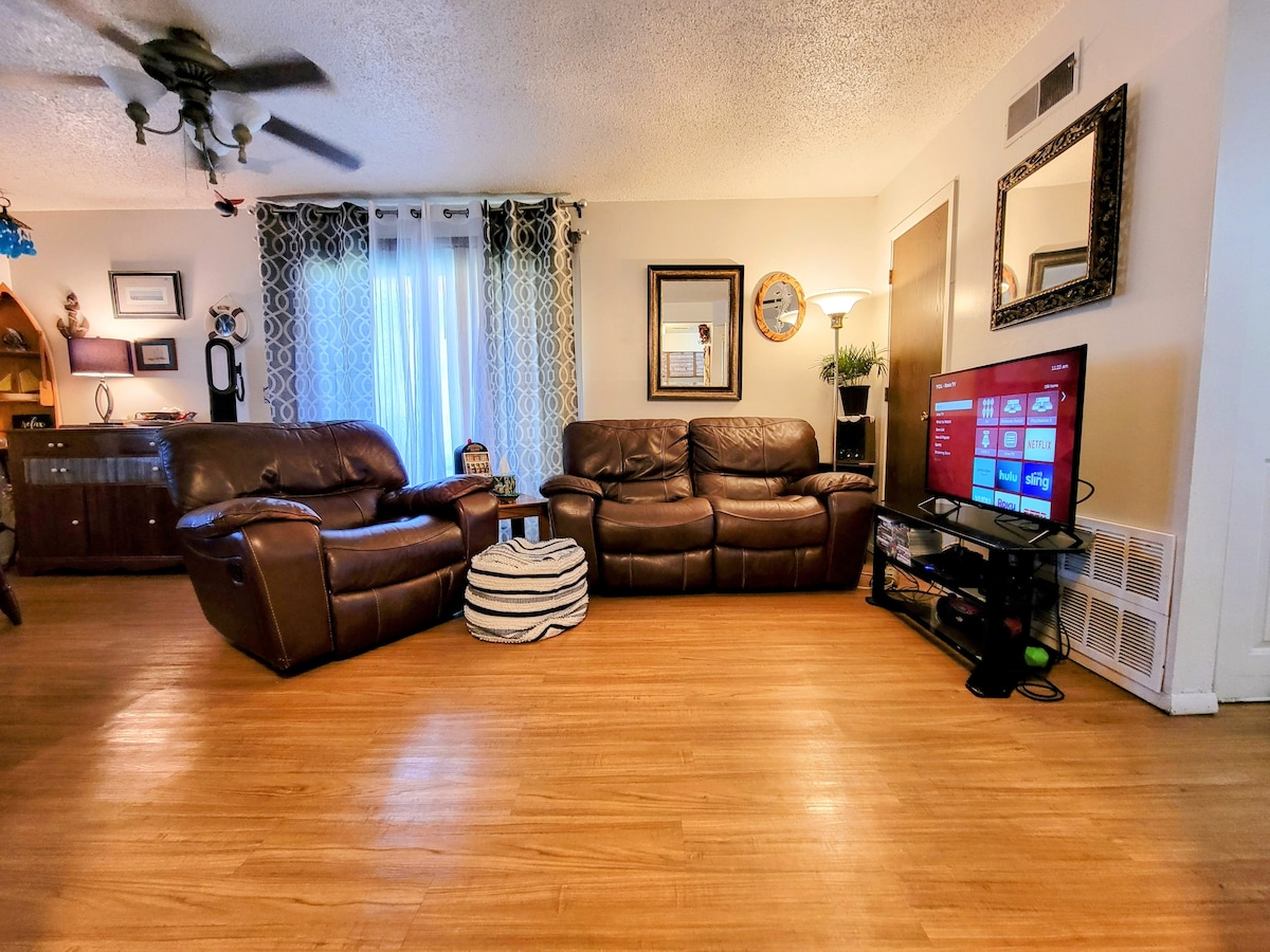 ¡Este dúplex es la parada perfecta para un viajero cansado! ¡Duerme en una cama tamaño king grande o en una cama tamaño queen ajustable! Garaje para estacionar. Este alojamiento es totalmente accesible para personas con discapacidad. Un nivel, pisos de madera antialérgenos en todas partes. Ducha a ras de suelo con barras de sujeción. Inodoro elevado. Para la comodidad de la sala de estar, ofrecemos una silla de masaje, un sofá reclinable eléctrico, un sistema de juegos Xbox y un televisor con canales premium en Roku. La cocina es muy abierta y está completamente equipada. A 10 minutos de KU y del centro de la ciudad, a 5 minutos de la I-70.