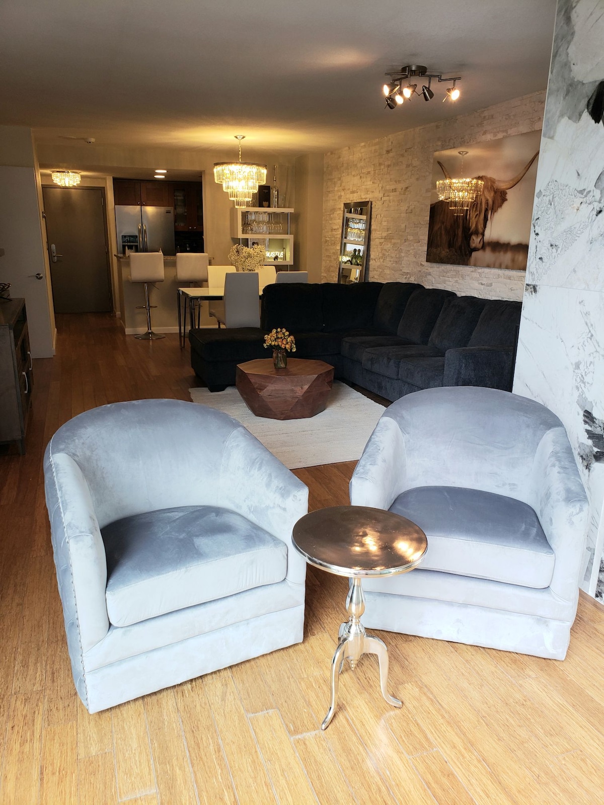Mi apartamento es un ático loft industrial de dos niveles con vistas a la ciudad desde todas las habitaciones. La casa tiene mucha luz natural y está situada en el centro de Denver. Disfruta de unas vistas espectaculares del horizonte de la ciudad por la noche y de las montañas Rocosas durante el día mientras cocinas en la parrilla de gas al aire libre ubicada en el gran balcón amueblado. Tiene una planta abierta que incluye una gran cocina gourmet con isla, sala de estar con chimenea de gas, comedor, dormitorio grande, sala de televisión y dos baños completos.
