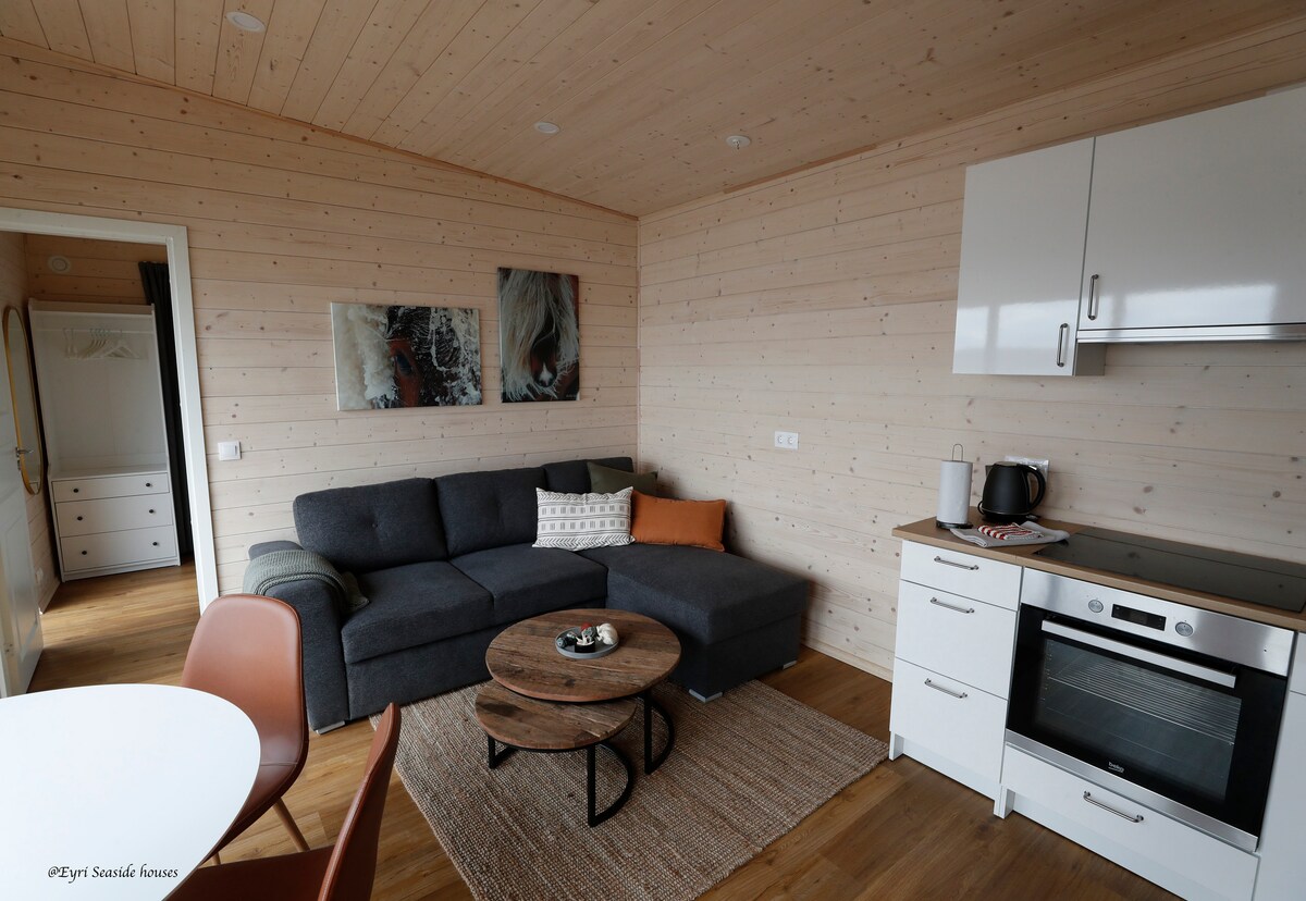 Eyri Seaside Houses is a cozy, warm and new guesthouse with a great ocean view on our small horse farm. We usually have horses at home, and if you like, you can contact us and we’ll let you pet them with us! We’re located in Hvammstangi but still very private, with only the ocean and landscape in view. There are a lot of birds at the beach, and there’s even a chance to spot seals. Occasionally whales enter the fjord, but you’ll need a lucky day to see them.