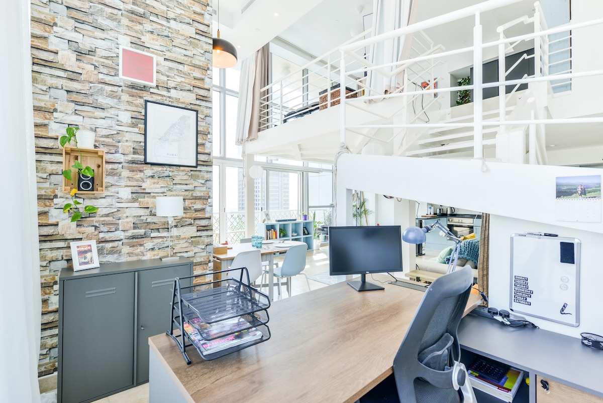 Disfruta de nuestro increíblemente luminoso apartamento loft dúplex de una habitación con unas vistas impresionantes al lago y a los rascacielos con ventanas del piso al techo, situado en el centro de JLT Dubai, junto al emblemático barrio de Dubai Marina. Viene con un área de escritorio designada, proyector, cocina totalmente equipada y balcón grande. El loft y el barrio de JLT admiten mascotas. Anfitrión: Superanfitrión experimentado y líder de anfitriones en Airbnb en Dubái. La piscina y el área de barbacoa están temporalmente fuera de servicio.