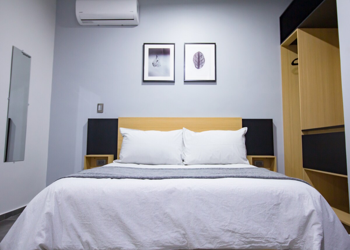 Acogedor alojamiento entero de una recámara para dos personas. Cuenta con dos pantallas, Netflix, Disny+ wifi, estacionamiento gratuito, agua caliente 24/7, utensilios de cocina, refrigerador, parrilla a gas, microondas, agua potable, dentro de un residencial privado con vigilancia las 24 horas. En el tercer piso en una de las zonas mejor ubicadas y conectadas de la ciudad. A un costado de supermercados, restaurantes y plazas comerciales. Cuenta con todo lo necesario para una excelente estancia.