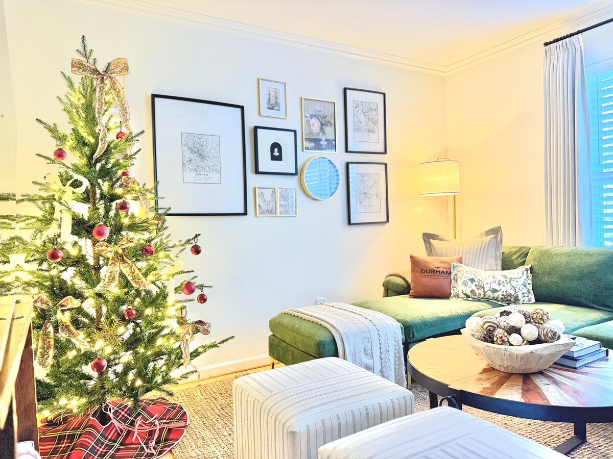 ¡Crea recuerdos inolvidables en este espacioso y bellamente diseñado alojamiento para ti + 9 huéspedes! Perfecto para reuniones familiares, eventos deportivos y ocasiones especiales. Situado en el corazón del centro de Durham, a solo 4 minutos del estadio Duke, Bulls, DPAC y Tobacco Trail. Acurrúcate alrededor de la chimenea, disfruta de una barbacoa o relájate con palomitas de maíz y discos de vinilo. Retirada en camas de lujo + sábanas y dirígete a la cafetería gourmet en la mañana. Acceso gratuito al gimnasio cercano con piscina. 4 colchones de aire y cargador para vehículos eléctricos disponibles.