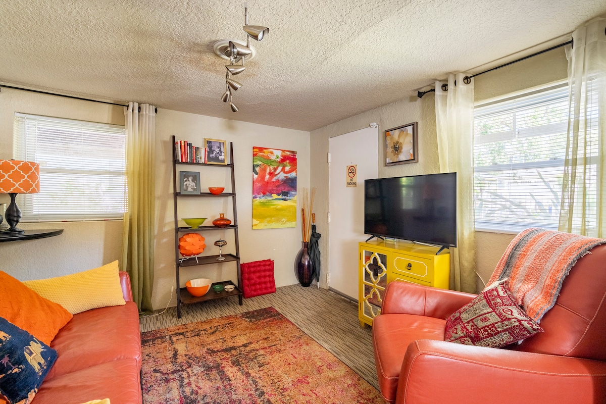 This luxe contemporary art inspired 1 bedroom nonsmoking/vaping) downstairs adults only apartment that is packed with very bold colors and is situated in an urban core Murray Hill/ Riverside area and is close to downtown, the interstates and the trendy restaurant district! This is a self-contained one-bedroom apartment that is part of an upstairs downstairs duplex. This is Florida and we do have bugs. We have monthly service but occasionally one gets inside. That doesn’t mean the unit is dirty!