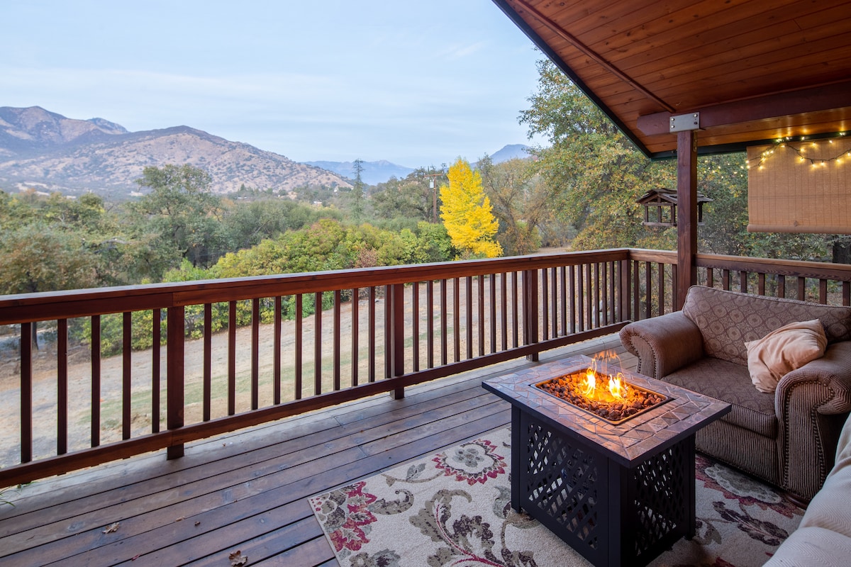 A gorgeous single level home designed for comfort in the true Alpine Chalet architectural style, and only a 7 minute drive to the Sequoia National Park Entrance! View the stunning panorama of Sierra peaks from large windows and an elevated deck. Feel as if you are floating while relaxing on the comfortable deck sofa; a great place to bask in the morning light with your coffee, or enjoy the fire table and watch the stars. Cozy bed, fully equipped kitchen, 50" TV and strong WiFi to support Zoom.