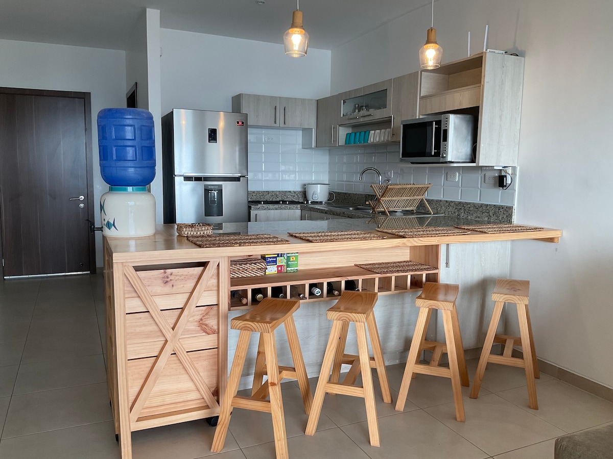 Moderno apartamento con vistas al mar, a pocos pasos de la playa El Murciélago (sede del Ironman 70.3), el centro comercial Mall del Pacífico y los mejores restaurantes locales. Perfecto para vacaciones/trabajo a distancia con un monitor proporcionado. Tranquilo, lejos del ruido de la calle. Seguridad las 24 horas, los 7 días de la semana e internet de fibra óptica de alta velocidad. Los servicios incluyen piscina, sauna y jacuzzi (abierto de martes a domingo, puede cambiar sin previo aviso). El edificio cuenta con un generador para las zonas comunes y un SAI mantiene el wifi en funcionamiento. El ascensor, el agua y el internet funcionan durante los cortes.