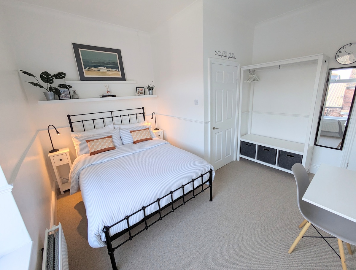Esta es una habitación independiente en la planta baja con baño con ducha, cocina pequeña y entrada privada. Caja fuerte con llave para un registro autónomo rápido y sencillo. Este es un espacio recientemente reformado, con una gran ventana y persiana que lo hace muy luminoso y brillante, pero con privacidad. Hay una cama doble con cajones de almacenamiento debajo, un vestidor con perchero, TV montada en la pared y una mesa desplegable montada en la pared con sillas plegables que hacen un espacio útil para comer/trabajar. Aparcamiento en la unidad