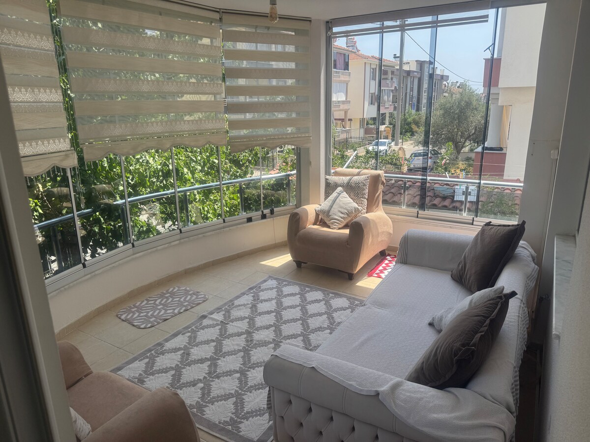 Puedes descansar en familia en este alojamiento tranquilo. Hay 300m. 2 balcones a la playa. Nuestro departamento es para 5 personas. Hay 2 camas dobles. Hay agua caliente, vitrocerámica, horno, lavavajillas, lavadora, TV, nevera. Hay internet ilimitado. Hay una cama de estacionamiento disponible para nuestros huéspedes con bebés. A 4 km de Altınoluk. A 10 km de Akçay. A 27 km del aeropuerto. Dolmus y en la ruta del autobús. Nuestro departamento se desinfecta después de cada proceso de llegada y salida.