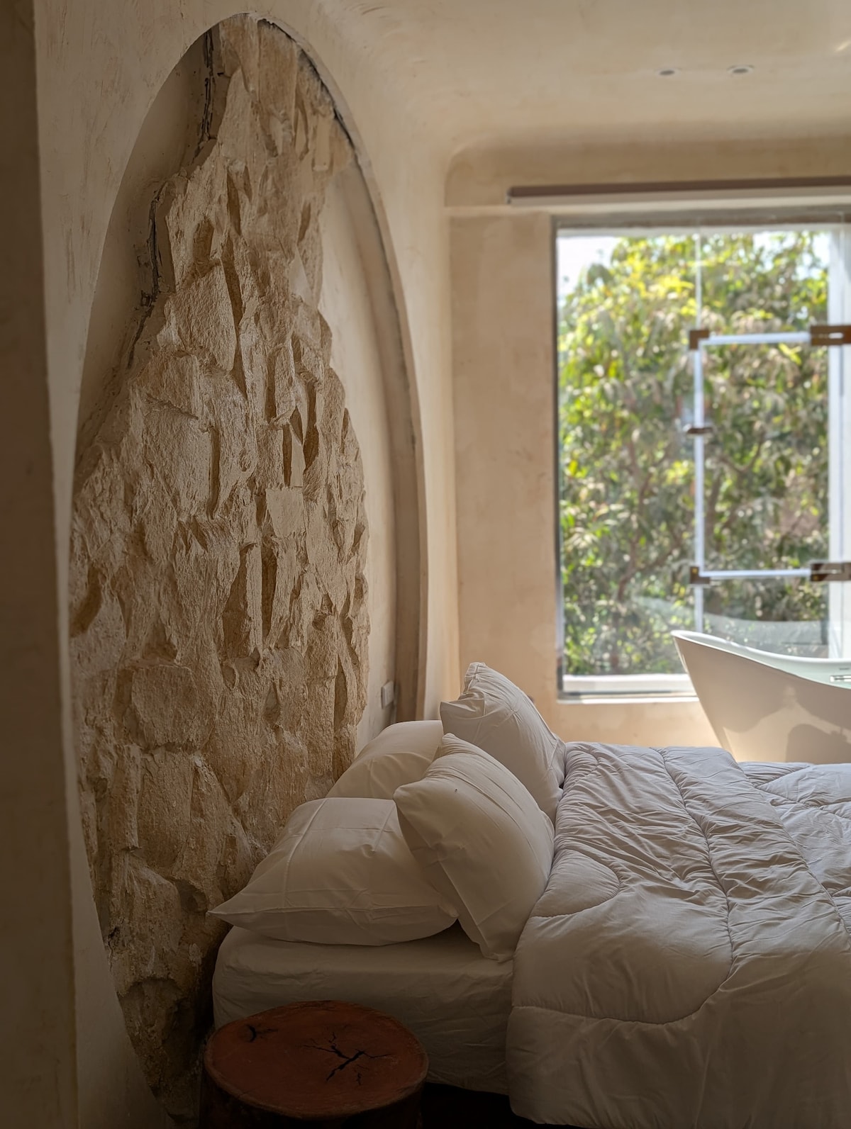 Sleep surrounded by storybook stone walls and soft desert light 🌿 This soulfully designed space features handcrafted arches, natural textures, and a sculptural hot tub by the window, where you can soak as sunlight through the trees and the Pyramid tip peeks into view ✨ Enjoy artistic handmade decor, and a warm, cave-like ambiance that reconnects you with nature and yourself. Head to the rooftop to share coffee with the Great Pyramids. A place made with love, and timeless charm. 🌄☕🧘♂️