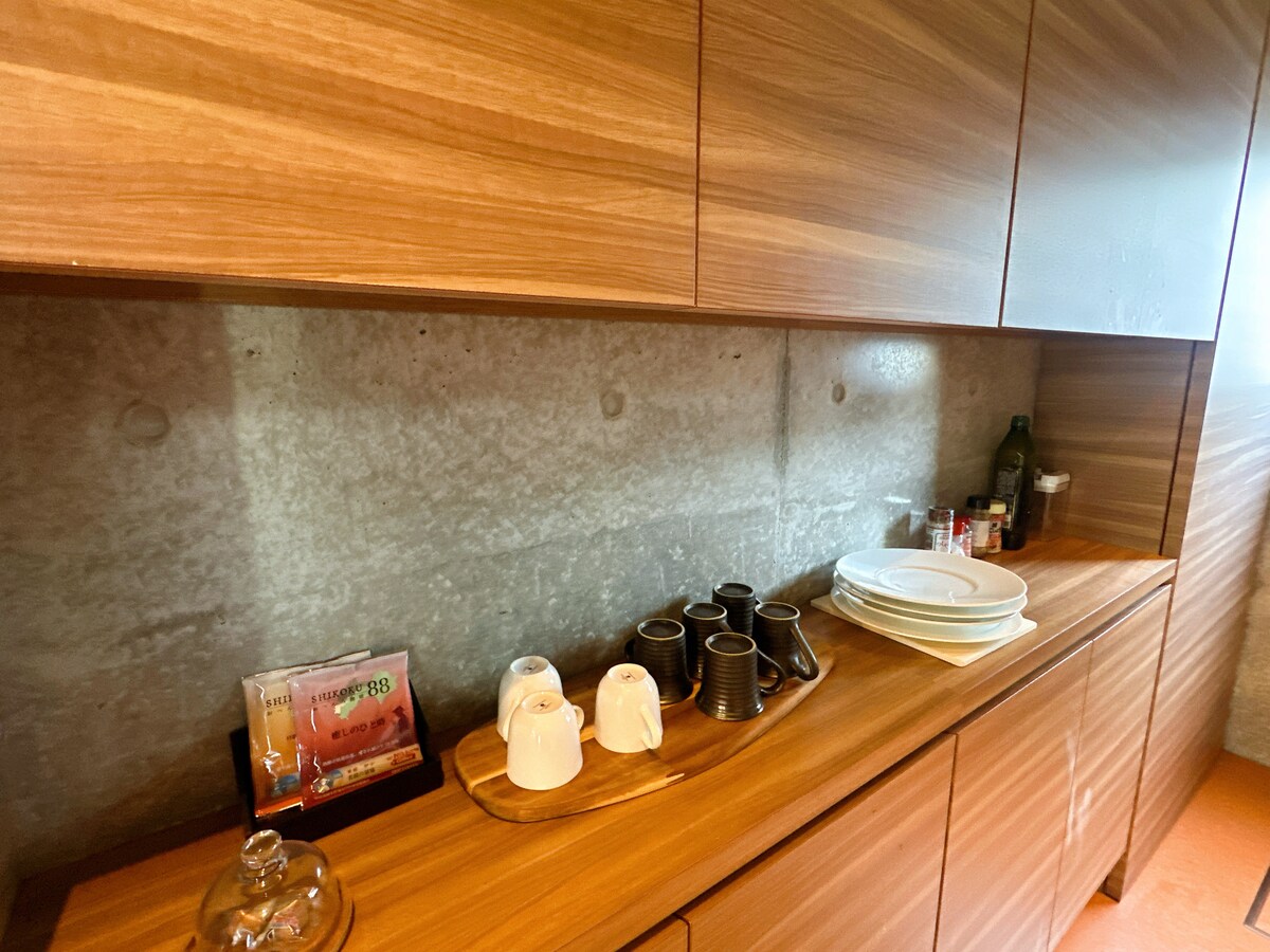 En la costa cerca de la estación de Shimonada en la ciudad de Iyo, prefectura de Ehime, abre un alojamiento privado de alquiler por día limitado a un grupo. Frente a ti se extienden el cielo y el mar, de un azul tan hermoso y claro que se pierde en el horizonte. El espacio está diseñado para ser relajante, con un suelo de tierra compactada. Con vistas al mar interior de Seto, en la primera planta, frente al mar, se puede cocinar en una cocina elegante mientras se ve la puesta de sol. En el segundo piso, puedes crear mientras ves la puesta de sol en la terraza. Hay una cama tamaño queen. Hay un sofá cama koala que se convierte en una cama tamaño queen. En el segundo piso hay una cama doble. Puede alojar hasta 4 personas. El desayuno incluye pan de levadura natural y café Rodan. La vajilla es obra del ceramista Tomoya Sasaki, de Ehime, y está hecha con Mustakibi y el horno de Longquan. Las toallas son de Iori de Imabari Towel. Las sábanas son de lino. Si desea cenar, puede hacerlo en el restaurante Shioji, que está al lado y es solo para huéspedes. El transporte a la estación es gratuito. Le ofrecemos una experiencia maravillosa y memorable. Disfrute de una villa con una vista sin igual de la hermosa Setouchi.