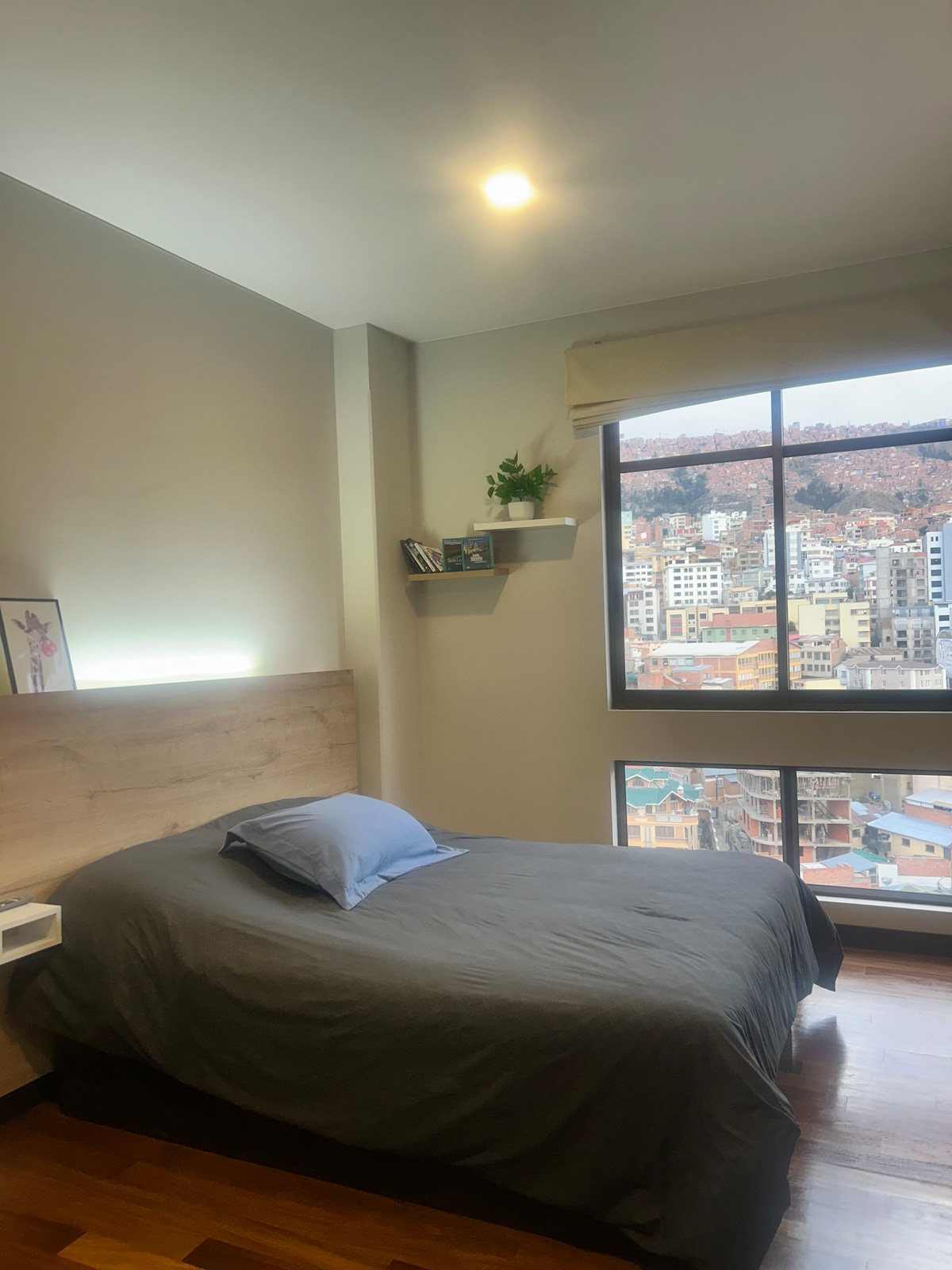 Departamento nuevo, amplio, en piso alto y muy iluminado. Ideal para viajes de descanso o trabajo. Tiene un dormitorio con walking closet, dos baños completos, cocina equipada y un gran salón comedor con hermosas vistas. Ubicado en zona segura, cerca de cafés, restaurantes y supermercados, con excelente conexión al transporte público. Si prefieres caminar, es perfecto para moverte con facilidad. Disfruta La Paz con confort, estilo y calidez. ¡Tu espacio acogedor te espera!