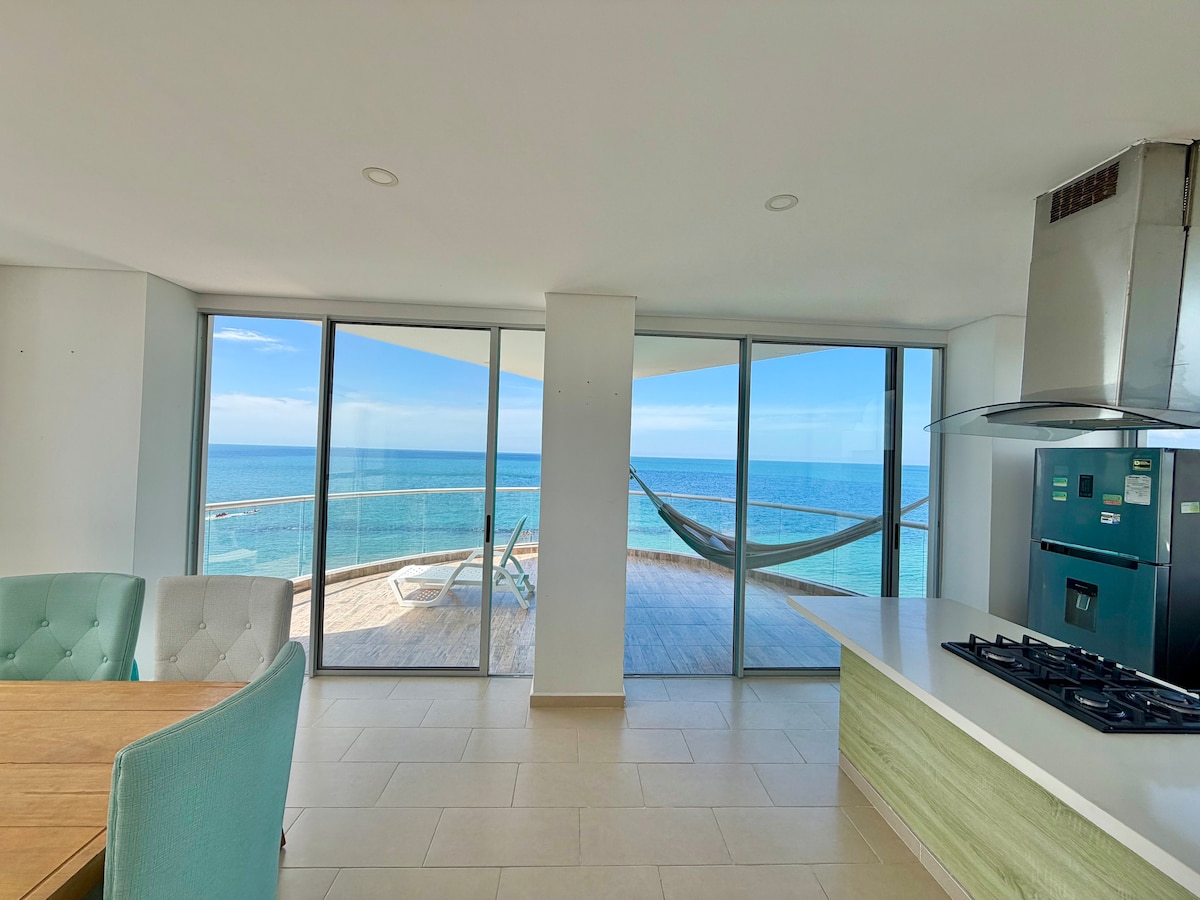 Espectacular apartamento frente al mar, con playa privada, piscina y portería las 24 horas. Es un primer piso, ideal para cuarentones a los que ya nos cruje la rodilla. El lugar perfecto para descansar, inspirarse o pasar un despecho. - Cama Queen (con cama auxiliar tipo sommier) - Sofacama - Televisor smart tv - Wifi - Cocina - Baño - Aire acondicionado - Terraza exterior - Parqueadero - Kiosko tipo sombrilla en la playa