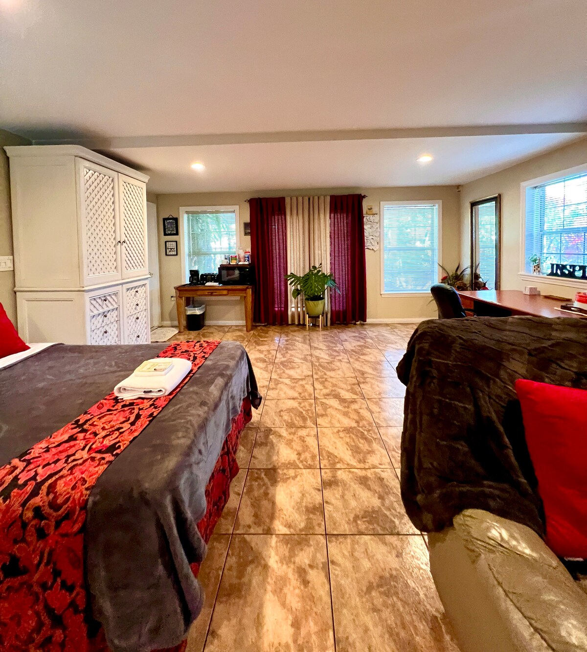 Esta hermosa suite de invitados tiene abundante luz natural. Con una ubicación ideal para acceder fácilmente a todas las áreas de Los Ángeles; a 15 minutos en auto de DTLA, a 30 minutos de LAX con tráfico ligero. A poca distancia a pie de restaurantes; (italiano, japonés, mexicano, Starbucks, etc.), el campo de golf Montebello, TOPGOLF y Country Club. Situado en un barrio agradable, tranquilo y seguro. Como se muestra en las imágenes, la habitación cuenta con una cama tamaño queen y una cama de tamaño completo. No hay TV en la habitación.