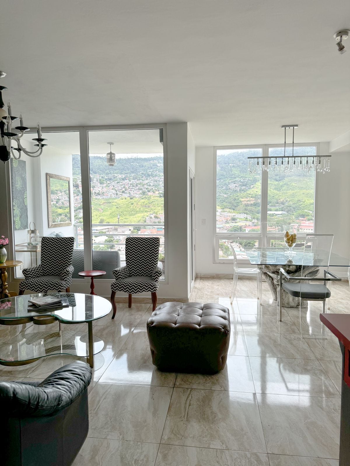 Apartamento de 2 habitaciones en piso 27, con increíble vista a la ciudad. Ubicado a solo 3 cuadras de la Embajada Americana, en una torre segura sobre el principal bulevar comercial de Tegucigalpa (Boulevard Morazán). El edificio cuenta con plaza comercial, restaurantes, barberías, mesas al aire libre y área verde con juegos para niños. Acceso inmediato a zona viva, bares y plazas.