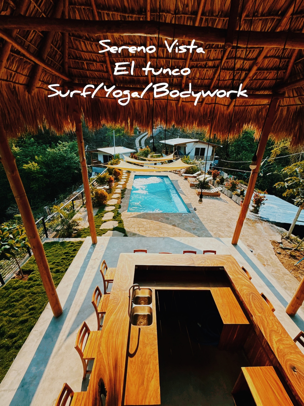 Simplifique su vida alojándose en este alojamiento tranquilo y bien situado. A pocos minutos de El Tunco, pero lo suficientemente lejos como para no oírlo y en la cima de la colina, esta nueva propiedad le permite relajarse junto a la piscina mientras disfruta de las vistas a las montañas y al mar. A solo 10 minutos en auto del nuevo centro comercial, playa Sanblas, El Zonte y Tamanique este alojamiento está en el corazón de Surfcity y sin vecinos. Tranquilidad y cercanía y excelentes vistas.