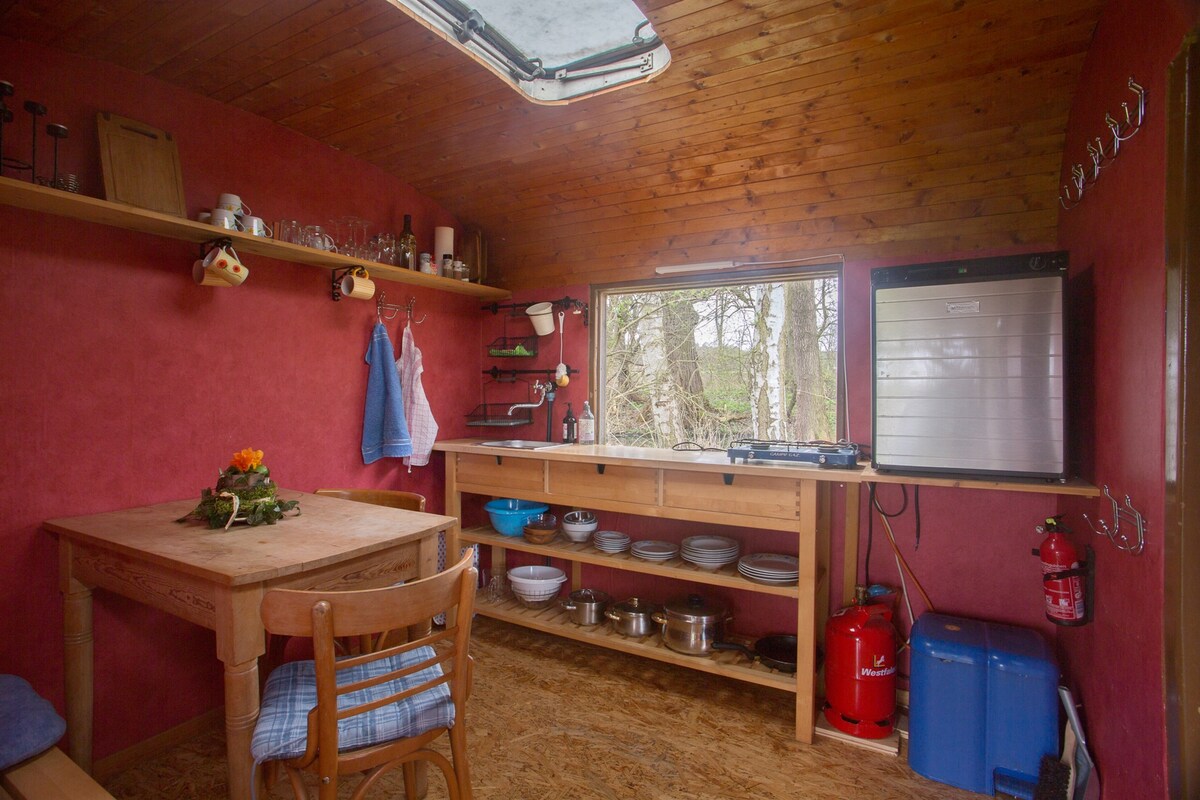 Romántica carreta de circo junto al río en el terreno de un antiguo molino de agua con cocina, sala de estar con chimenea y dormitorio para dos personas. 2 camas supletorias posibles (sofá de 1,20 m en la sala de estar). Terraza. Baño compartido en un remolque de obra separado con aseo separado (a unos 50 pasos de distancia). Atención: En caso de peligro de heladas, el agua debe cerrarse temporalmente.