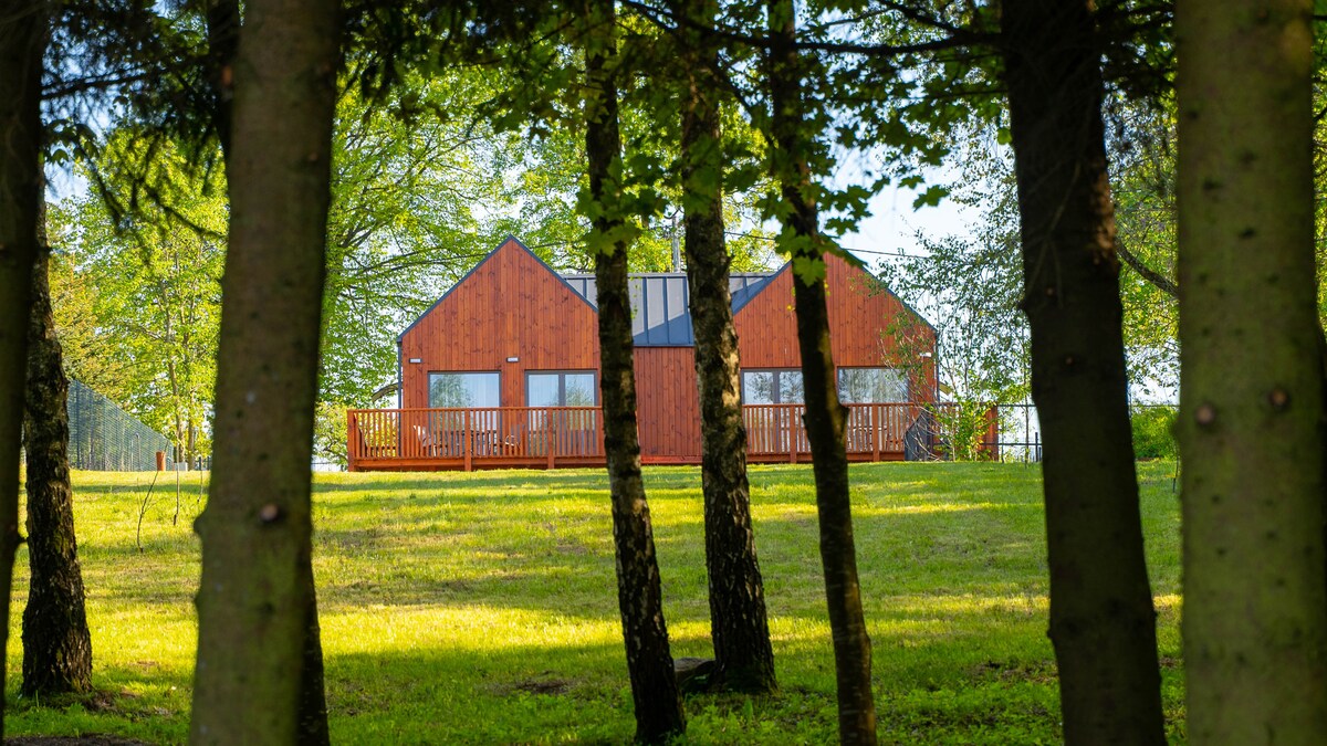 Un granero moderno situado en la zona de amortiguación del Parque Nacional de Biebrza, en el área Natura 2000, cerca del río Biebrza. Gracias a las ventanas panorámicas, puedes admirar la naturaleza sin salir de casa. Gracias al acristalamiento de toda la fachada (18 m), se puede observar una «imagen viva», un espectáculo de la naturaleza durante todo el día. Dependiendo de la temporada, puedes seguir desde el sofá/bañera/cama los bancos de arena de Biebrza, el vuelo de gansos y grullas, el lugar de alimentación de los castores, la caza de halcones, zorros, paseos de alces, cabras montesas y muchos otros animales.