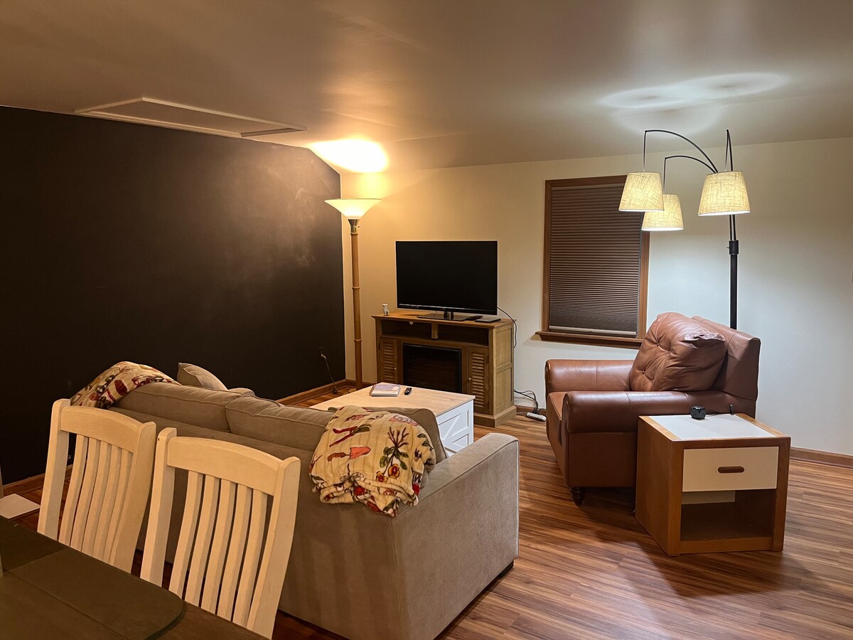 Kick back and relax in this calm, stylish space. This second floor apartment boasts a newly remodeled bathroom, a full kitchen, a comfortable bedroom perfect for two & a cozy sitting area with chairs that convert into twin beds. It also offers off street parking for one vehicle & a private entrance on the deck. It's a perfect place to relax & enjoy the summer & fall. Along with our cat Taffy who will welcome you (but will not be a bother) we invite you to enjoy our home.