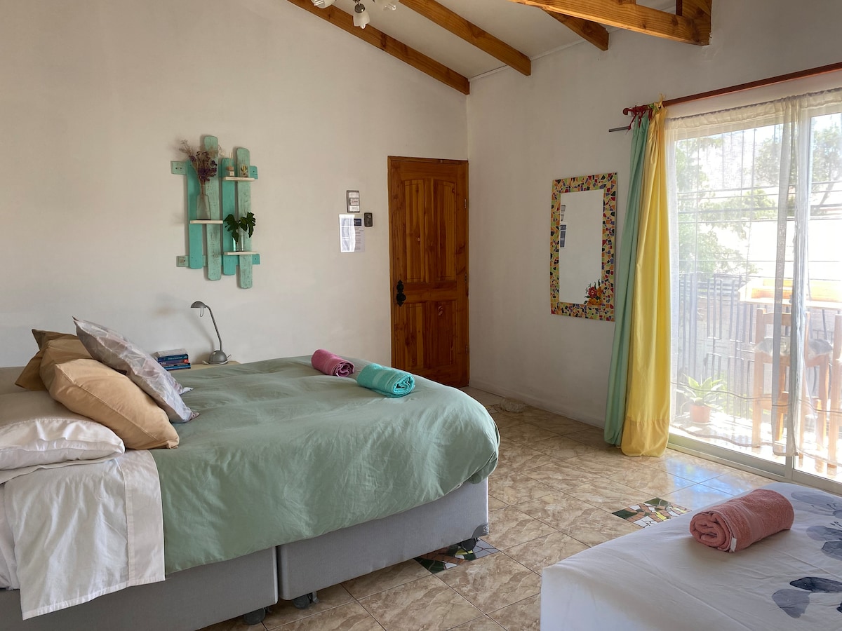 Departamento estudio; artístico, mosaicos de materiales reutilizables, muebles reciclados, versátil. Una cama matrimonial y otra de plaza y media. Para hasta 3 personas. Entrada independiente. Baño privado. Wifi. Sin estacionamiento. Kitchenette full equipada. Balcón con mesa y sillas.