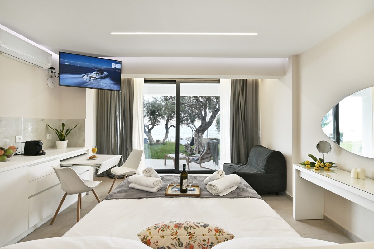 Esta habitación está ubicada en nuestros jardines, con un dormitorio independiente y un espacio abierto con la cocina. Es la opción perfecta para familias numerosas de hasta 5 miembros. También se proporcionan aire acondicionado, TV, baño con ducha y terraza con vistas al mar.