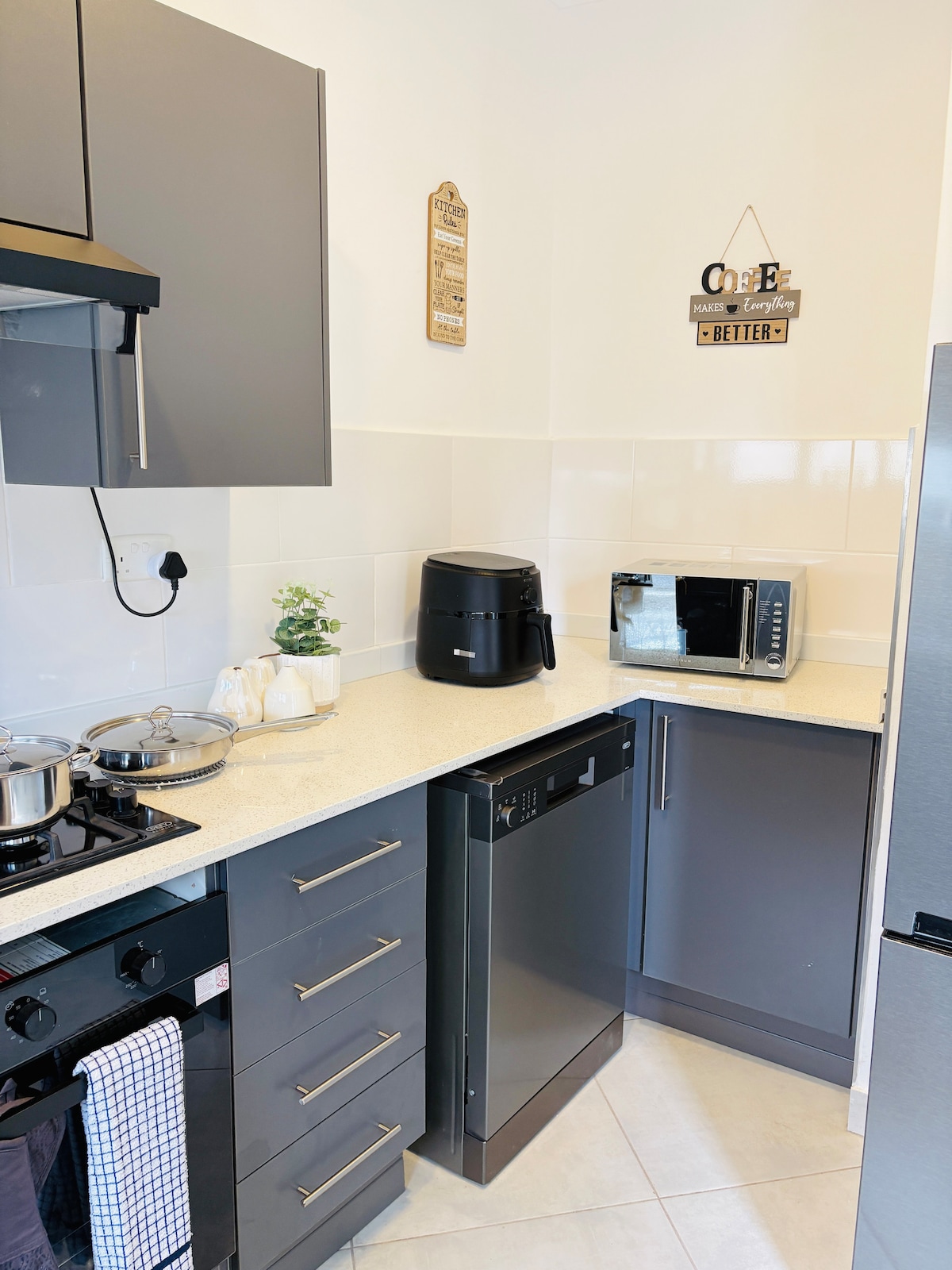 Airport Gateway es una cómoda unidad de dos dormitorios con baño privado a solo 4,7 km (5–10 minutos en auto) del aeropuerto. Incluye una cocina americana privada y una sala de estar, ideal para familias, colegas o huéspedes en tránsito que prefieren el autoservicio. La cocina pequeña está equipada con estufa de gas y eléctrica, nevera, microondas y jarra eléctrica, mientras que el salón tiene un sofá y TV inteligente. Los huéspedes disfrutan de estacionamiento seguro, conexión Wi-Fi rápida, llegada autónoma, agua caliente, ropa de cama limpia y un entorno tranquilo y seguro.
