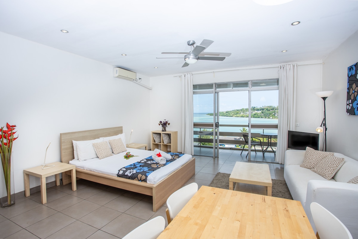 Lovely studio apartment with awesome views over Port Vila Bay. Fully equipped kitchen, serviced, security, swimming pool, A/C, TV, WiFi, daily housekeeping, car park, front office, on-site management. Lovely gardens with lots of spaces to sit, work or watch the world go by. Plenty of eateries, a beach bar, the best French bakery, shopping, markets, yoga schools, fitness center and tennis club are in easy walking distance. Public transport on your doorstep. You'll love it here.