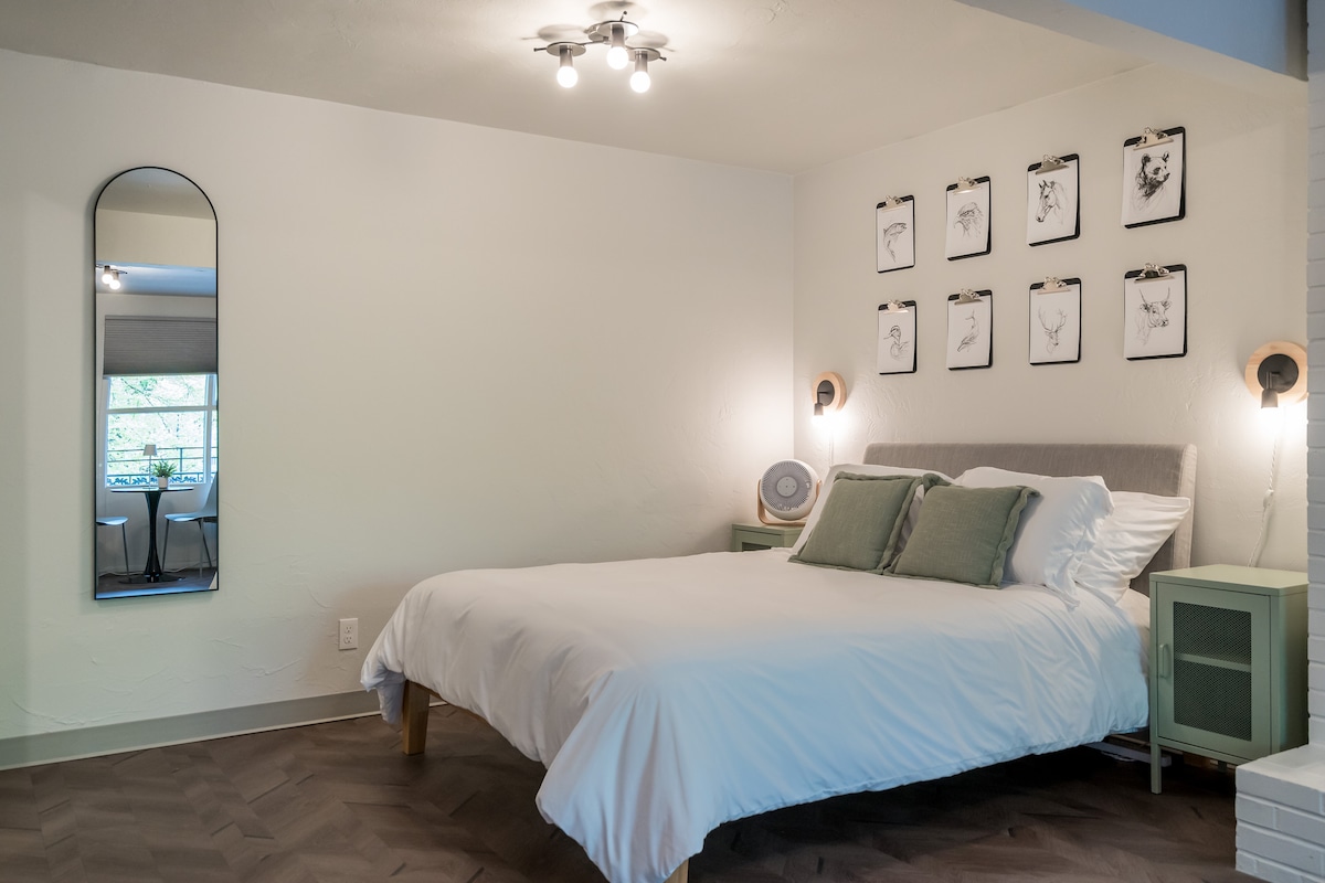 Disfruta de una estancia boutique cuidadosamente diseñada en el corazón de Eugene. Los tonos cálidos de madera, una lujosa cama tamaño king, sábanas frescas y una iluminación suave crean un refugio tranquilo después de explorar el mercado de la calle 5, la Universidad de Oregón, Hayward Field o los senderos locales. Disfruta de estacionamiento gratuito, conexión Wi-Fi de alta velocidad, televisor inteligente de 55 pulgadas, ducha privada con azulejos, estación de café personalizada y artículos de tocador de primer nivel. Cocina pequeña con mininevera/congelador, microondas. Registro sin llave para mayor comodidad. Diseñado y operado por un habitante más.