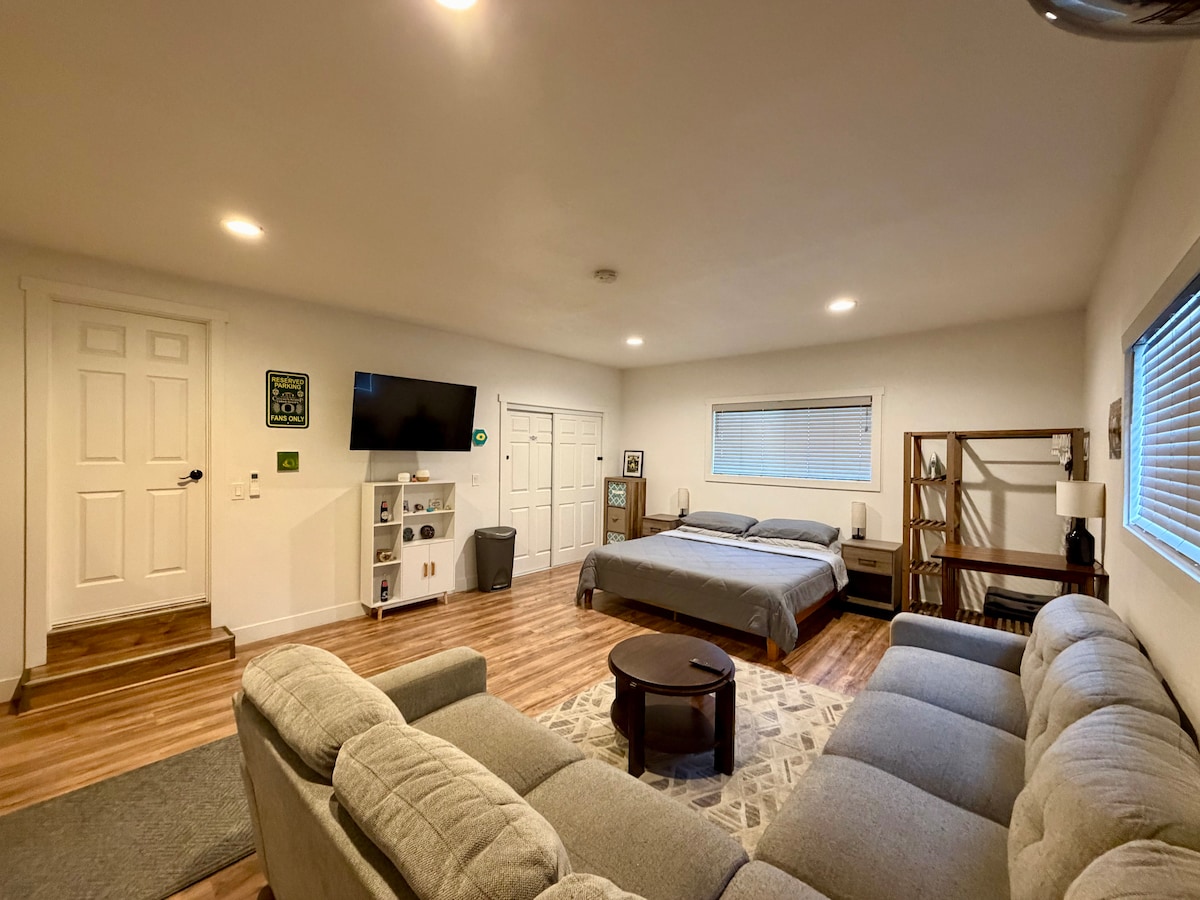 Welcome to our Duck’s Nest! 4-mi to Eugene Airport, 5-mi to UO & Autzen! Large private studio apartment w/ king size Casper bed, large sectional couch, 55in 4k TV w/ Ad Free Disney+, Hulu, and HBO Max. Kitchenette with dining table, microwave, mini fridge, & coffee machine w/ k-cups. Full bath w/ body wash, shampoo, and conditioner dispensers, laundry room w/ washer and dryer. Backyard has personal enclosed gazebo. Sorry, no parties. Come stay with us today! And Go Ducks!