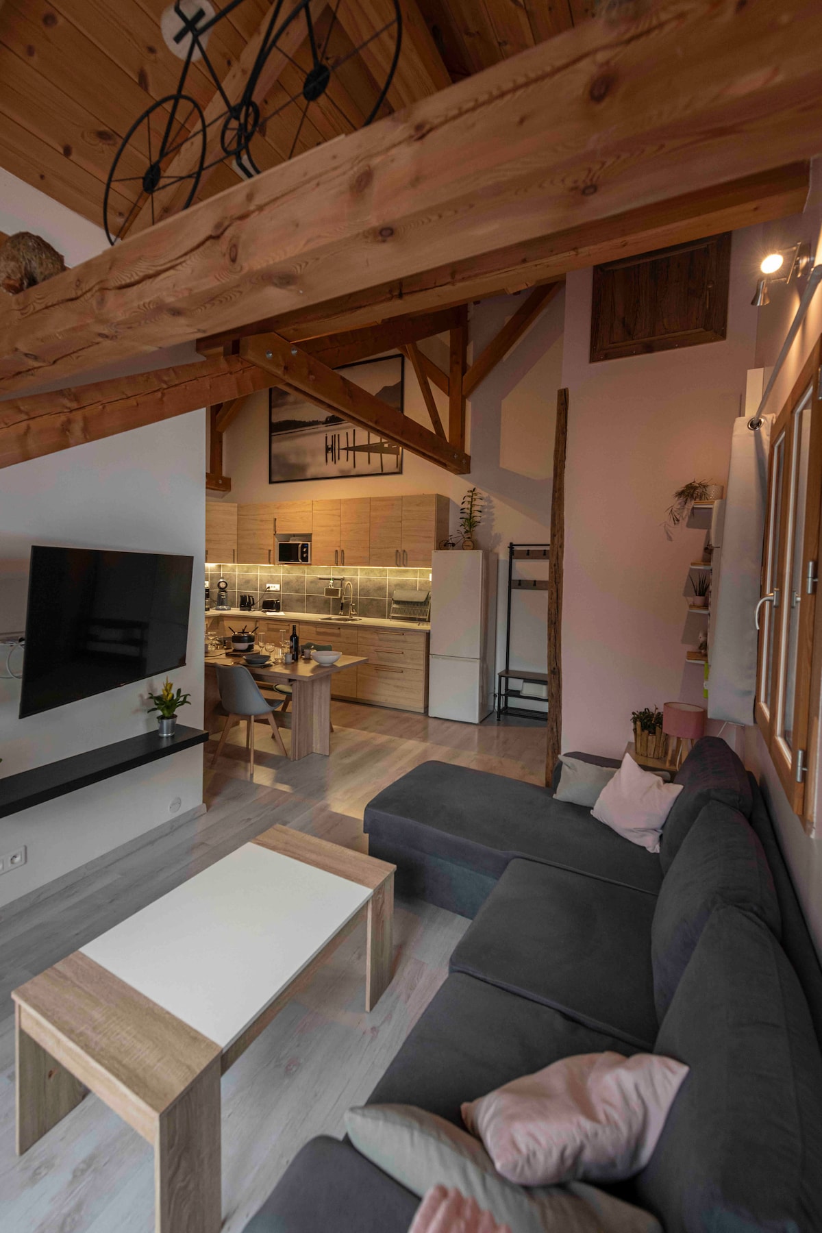 El chalet ofrece vistas panorámicas a las cumbres desde todos los lados. Además de la sala de estar, cuyos ventanales dan la impresión de vivir en el paisaje, la planta superior ofrece 3 dormitorios (2 cerrados) y un baño, todos con grandes aberturas para multiplicar los puntos de vista. El diseño interior, una mezcla de autenticidad y modernidad, adopta el estilo chalet como hilo conductor, en armonía con la madera dominante, dejada al natural. La elección de los colores y materiales asegura un ambiente acogedor.