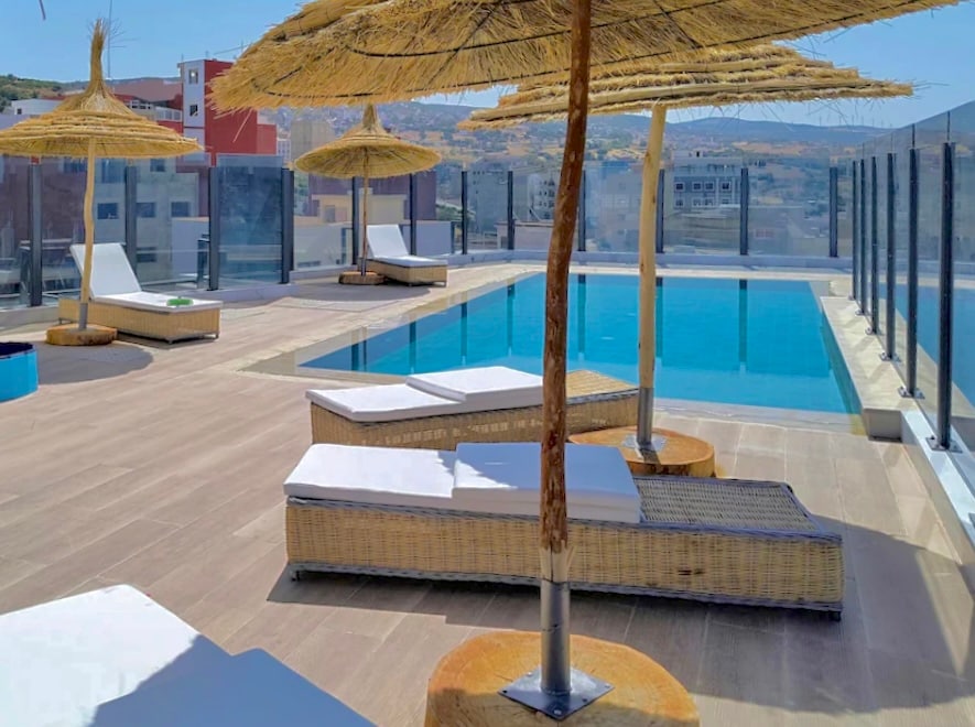 Elegante dúplex en Residencia Sania, Tánger, con 3 dormitorios, 2 baños y una gran terraza en la azotea con piscina y vistas al mar. A solo 5 minutos de la playa, cerca de cafés (Cappuccino, RR Ice, La Vue) y del supermercado Carrefour. Acabados de alta gama, aire acondicionado y estacionamiento gratuito. Perfecto para una estancia tranquila. No se permiten fiestas ni grupos. Piscina de temporada: consulta la disponibilidad.