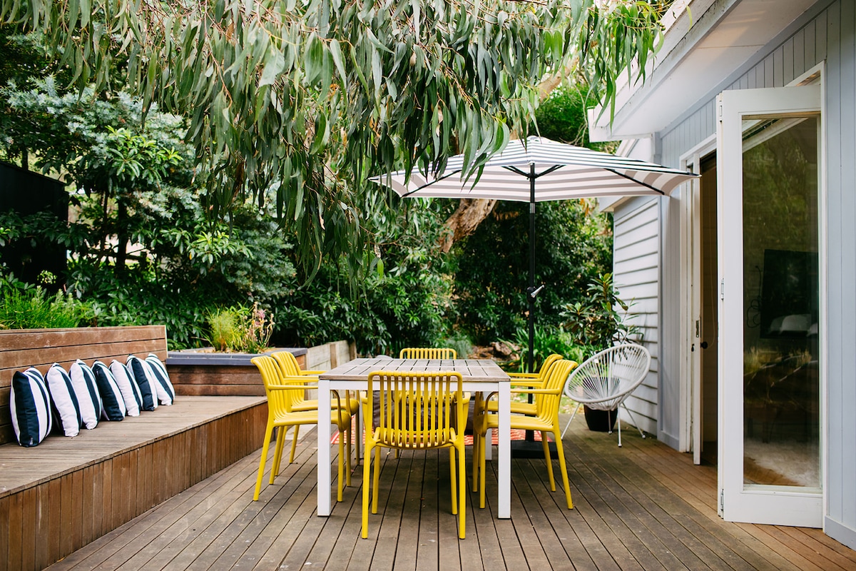 Una casa independiente de 3 dormitorios en un entorno tranquilo de arbustos y callejón sin salida, en el lado de la playa de Great Ocean Rd. Escucha el surf en una noche tranquila y contempla las estrellas junto a la chimenea al aire libre en un patio privado. Totalmente renovada con una gran sala de estar, cocina totalmente nueva, 2 baños nuevos, calefacción y refrigeración central. A pocos pasos del acantilado de Surf Coast y de hermosas playas. A poca distancia a pie de tiendas y restaurantes locales.