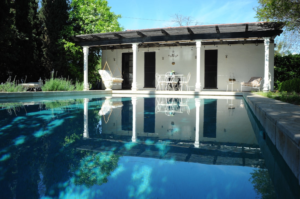 ¡Casa de huéspedes en Hillside en 5 acres! Nuestra propiedad, una de las últimas casas originales de naranjos, se encuentra junto a una reserva natural para una escapada tranquila. Aunque somos privados y serenos, estamos a pocos minutos de Claremont Colleges, Webb School y tiendas locales. Disfruta de un retiro tranquilo después de un día de exploración, visita a la familia o de negocios. Tu casa de huéspedes cuenta con una entrada privada, un amplio estacionamiento y servicios cuidados para que disfrutes de una estancia cómoda.
