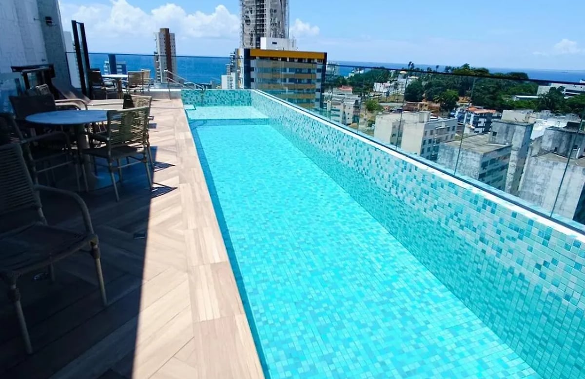 Estudio en Barra, con vistas al mar y condominio en la PARTE SUPERIOR con piscina en la azotea, gimnasio completo, lavandería profesional de autoservicio y oficina. Apartamento con aire acondicionado, wifi (300 mbps), ducha eléctrica y cocina bien equipada. En el corazón del Carnaval: a 3 minutos de la playa y de la calle por donde pasan los tríos eléctricos. Cerca del faro de Barra, playas, lugares de interés y bares, restaurantes, mercados y centro comercial.