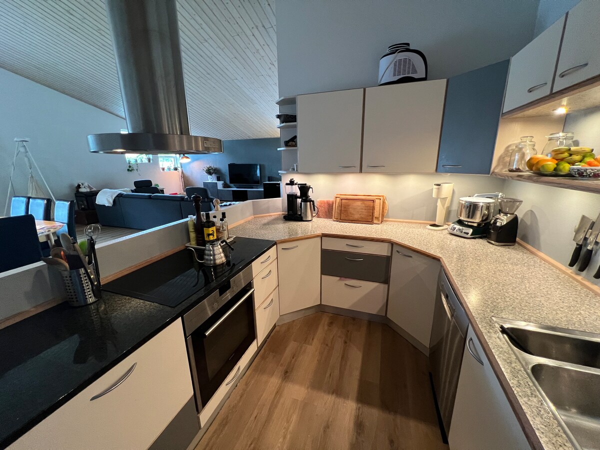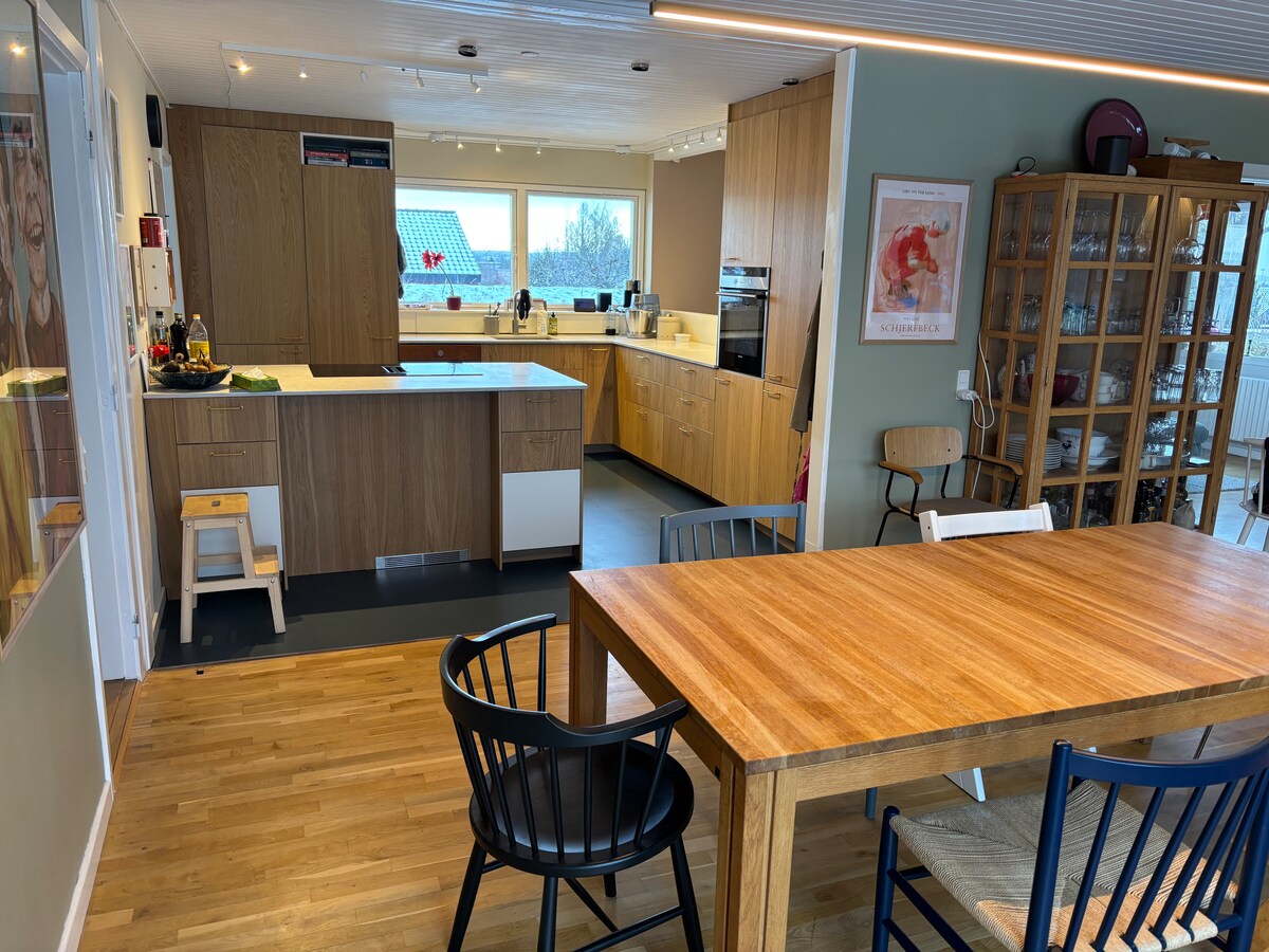 Gran villa luminosa para familias con gran terraza orientada al suroeste en jardín cerrado. El corazón de la casa es la gran cocina abierta y luminosa con hasta 10 mesas de comedor y acceso directo a las terrazas. Vivimos en un tranquilo callejón sin salida, a pocos pasos de la mejor playa, bosque, cafés, tiendas y a 5 km de Aarhus C. La villa tiene más de 300 m2, ideal para dos familias. Hay hasta 10 buenos lugares para dormir.
