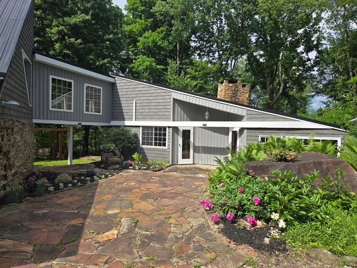 Smiling Mountain is a hand hewn wood, stone and glass tree house close to Seven Springs, Hidden Valley Fallingwater, and the GAP Trail. This 4BDR, open floor plan home features 19' accordion glass door that opens onto an elevated deck. Complete with 2 wood burning fireplaces, gourmet kitchen, dining table for 12 (one inside, and one outside), the house showcases art from world travels and hand-made light fixtures. Steps away from the Roaring Run Nature Area- Hike, Bike, Ski or just relax.