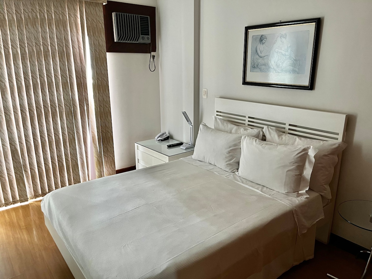 Piso en el Garvey Park Hotel recién reformado con 1 cama de matrimonio y 1 cama individual, baño, Smart TV, minibar, microondas, aire acondicionado, ropa de cama completa y wi-fi. Piso ubicado en el centro de Brasilia, a pocos metros de restaurantes y centros comerciales. A poca distancia de la explanada de los ministerios y otros puntos turísticos de la ciudad.