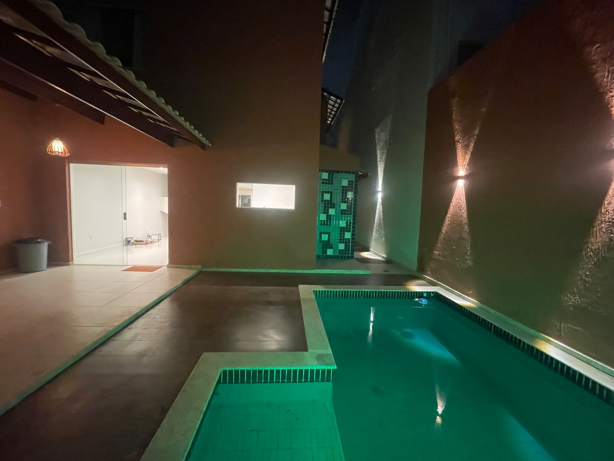 Lleva a toda la familia a este gran lugar con mucho espacio para divertirse, con piscina y zona gourmet. La casa viene con todos los utensilios, sábanas y toallas. Garaje para vehículos pequeños y medianos Sala de estar y comedor. 4 dormitorios (1 doble en suite con aire acondicionado/ 1 doble con ventilador/ 1 individual con ventilador + colchón/ 1 en suite externo con inodoro y cama doble) *habitaciones disponibles según el número de personas* 2 baños Cocina. Lavandeira Área gourmet Piscina (consultar disponibilidad)